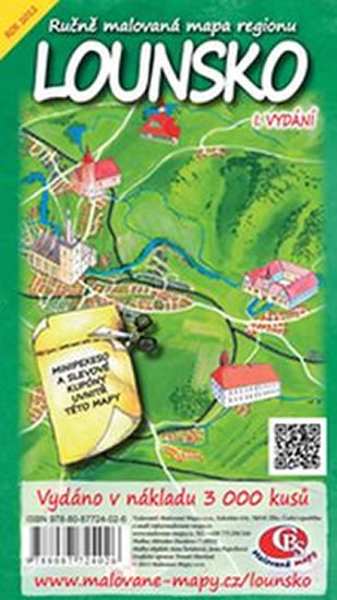 Ručně malovaná mapa působivě ztvárňuje území okresu Louny. Je to umělecké dílo a mapa zároveň. Najdete tu všechny turistické chodníky, zvýrazněné historické památky a přírodní zajímavosti. Mapa je doplněná o prezentaci okolních obcí a měst, z kterých se dozvíte zajímavosti z jejich historie i současnosti. Mapa je oboustranná. Na přední straně je zobrazená mapa Lounska, na zadní straně najdete informaci o důležitých místech, institucích, ubytování, stravování a jiných službách pro turisty.