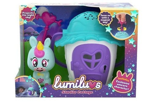 Set domečku a Jednorožce. Domeček pro Lumiluvs zahraje hudbu a rozsvítí hvězdy a srdíčka. Jednorožec svítí a brblá po fouknutí na bříško a pusince. Baterie: 3xAAA není součástí balení(domek), 3xLR44 je součástí balení (figurka). Pro děti od 3 let.