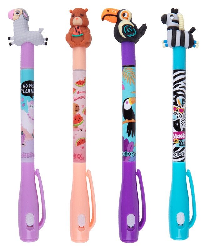 Napiš tajný vzkaz, který jen tak někdo neodhalí. Kombinované pero ukrývá nejen klasickou kuličkovou náplň, ale také neviditelný inkoust, jehož text se zobrazí po nasvícení UV světlem ukrytým ve víčku pera. Skvěle se hodí pro běžné poznámky, zábavu i originální hry.brbrKombinované kuličkové pero s veselými koncovkami ve tvaru zvířátek.