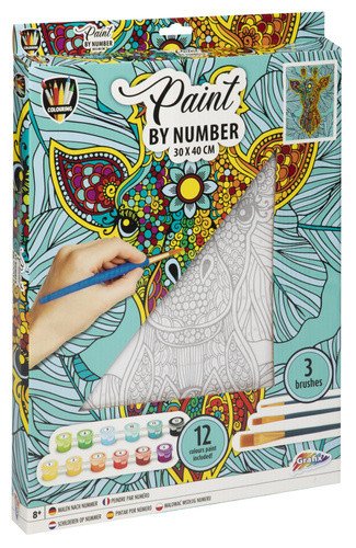 Malování podle čísel na plátno Žirafa 30×40 cm – balení obsahuje obrázek vytištěný na bavlněném plátně, 12 barev a 3 ks štětců.