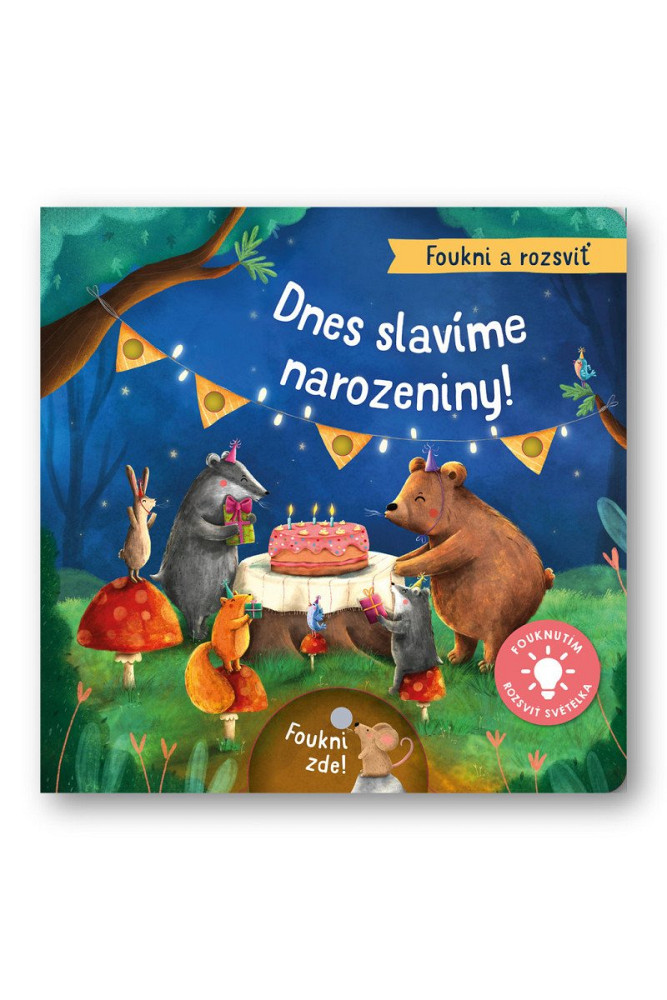 Foukni, rozsviť, počti si - fouknutím rozsviť světélka. Dnešek je pro Medvídka speciální den. Má narozeniny a jsou mu právě tři roky. Jeho přátelé chystají vše na večerní oslavu. Zajíčci pečou výborný mrkvový dort, rodinka Jezevců má plné ruce práce s balením dárků a Myšky nadšeně připravují výzdobu. A co dělají Veverky? Mají plné ruce práce s nazkoušením hudebního přání. Foukni na knížku a nechej také rozzářit světélka!