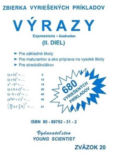 Sú pokračovaním Výrazov I. diel, zväzok 18. Výrazy II. obsahujú 680 vyriešených príkladov v 8. kapitolách. V kapitole 1 sú na obrázkoch znázornené algebraické vzťahy druhej a tretej mocniny z jednočlena, dvojčlena a trojčlena. Druhá kapitola sa sústreďuje na príklady mocnín dvojčlenov. Rôzne obmeny dosadení čísla, premennej či faktoriálu, umožňujú pochopiť rozličné realizácie druhej mocniny dvojčlena. Kapitola 3 sa zaoberá treťou mocninou dvojčlena a 4. kapitola rozdielom štvorcov. Pochopenie druhej mocniny dvojčlena, úpravy rozdielu štvorcov na súčin, sú dôležité algoritmy, ktoré využívame pri rôznych úpravách v rôznych odvetviach matematiky. 5. kapitola sa sústreďuje na druhé mocniny trojčlena, 6., 7. a 8. kapitola na druhé mocniny zložitejších dvojčlenov. Výrazy a ich úpravy v najrozmanitejšej podobe patria k najdôležitejším schopnostiam a zručnostiam, ktoré musí zvládnuť človek od prvého ročníka základnej školy až po maturitu tak, aby v životných situáciách ich vedel uplatniť. Knihy Výrazy I. a II. diel poskytujú istú časť algoritmov na danú tému.