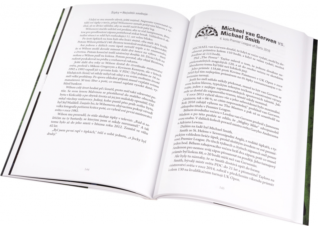Autor této knihy Matt Bozeat s přispěním nejslavnějších hráčů šipek vypráví příběhy skryté za 50 největšími zápasy historie tohoto sportu. Kniha zahrnuje také exkluzivní rozhovory se 16 mistry světa, mj. Michaelem van Gerwenem a Philem „The Power“ Taylorem, kteří vzpomínají na dramatické a vrcholné okamžiky svých hvězdných kariér. Dočtete se tu o legendárních zápasech mezi Taylorem a van Barneveldem i starších duelech legend, jako byli Eric Bristow, Jocky Wilson, John Lowe, Leighton Rees a mnoho dalších. Odhalíte tajemství toho, jak Taylor ovládl svět šipek, Andy „Viking“ Fordham se pokusí rozpomenout na večer, kdy se stal mistrem světa, a dozvíte se, proč být příliš chytrý nepomůže k tomu, abyste se stali dobrými hráči! Kniha ŠIPKY – Největší souboje – Padesát nejlepších zápasů sleduje historii tohoto sportu od jeho televizních začátků v 70. letech minulého století až do dnešních dnů. Předmluva k českému vydání pak přináší jako bonus navíc ještě popis jednoho zápasu významného z pohledu českých šipkařů a šipkových fanoušků. Tuhle knihu prostě musíte mít!