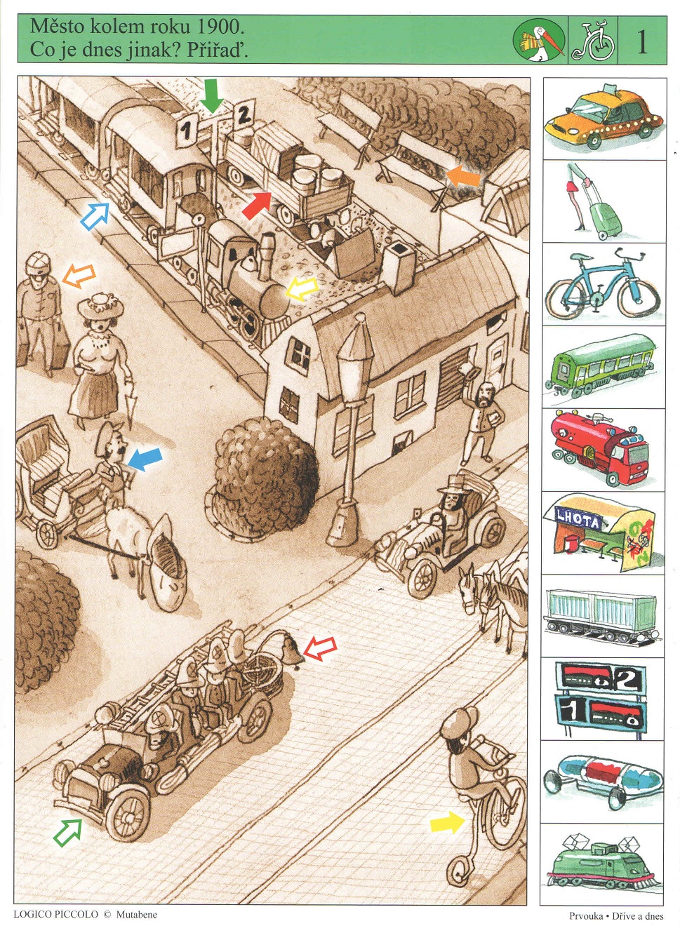 Ve městě – karty 1 až 4 – porovnávání obrázků; porozumění obsahu obrázků; nalezení ekvivalentů – karta 5 – zařazení obrázků do správné doby – karta 6 – doplňování obrázků do tabulky vývoje (Dávná minulost – kolem roku 1900 – dnes)
