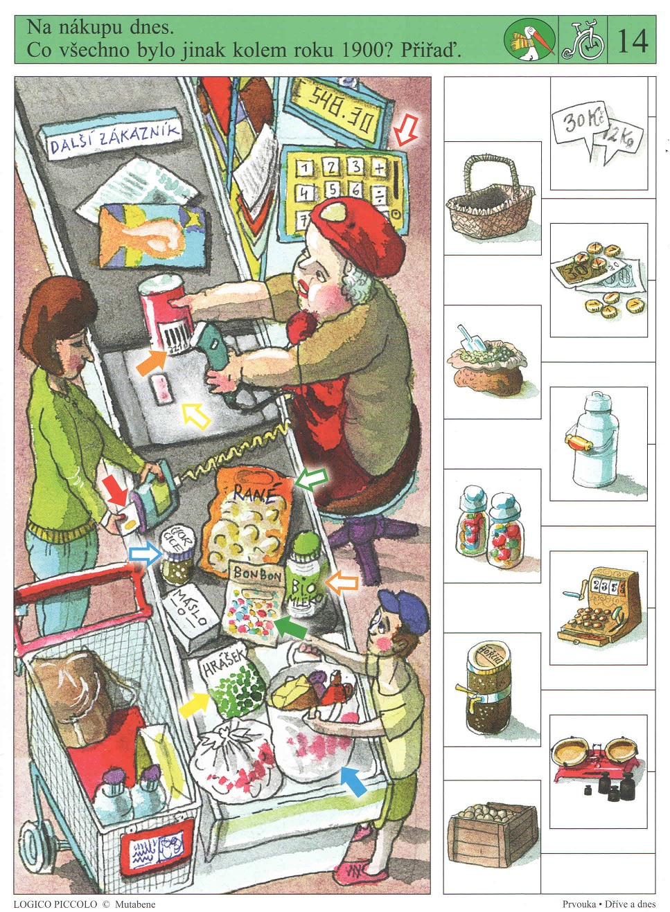 Na nákupu – karta 14 – porovnávání obrázků; porozumění obsahu obrázků; nalezení ekvivalentů – karta 15 – určení potravin z doby kolem roku 1900