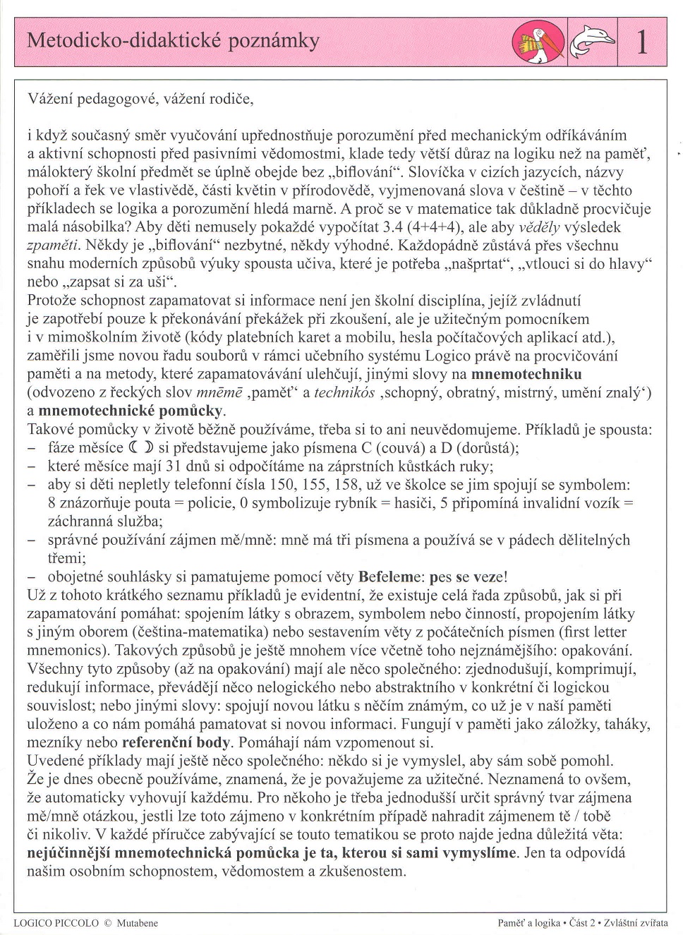 Nová řada "Paměť a logika" je zaměřená na procvičování paměti a na způsoby, jakými si děti mohou ulehčit zapamatování – odbornými slovy na memorování a mnemotechnické pomůcky. I přes největší úsilí současných vyučovacích metod založených na pochopení a propojení látky místo dřívějšího učení se nazpaměť a odříkávání, stále existuje spousta učiva, které vyžaduje neoblíbené "biflování", například slovíčka v cizích jazycích, malá násobilka, vyjmenovaná slova, data ve vlastivědě, odborné výrazy v přírodovědných předmětech. Mnemotechnické pomůcky využíváme denně, třeba i nevědomě. Příklad z mateřské školy: Děti si mají zapamatovat důležitá telefonní čísla 150, 155, 158. Aby si čísla nespletly, propojují je se symbolem: 8 znázorňuje pouta = policie, 0 připomíná hadici = hasiči, 5 symbolizuje obvaz = záchranná služba. Příklad ze základní školy: děti se učí správně používat zájmena mě/mně. Pomáhá se jim vysvětlením, že "mně" má tří písmena a používá se v pádech dělitelných třemi. Příklad ze života: když máte možnost sami si zvolit přístupové heslo k počítačové aplikaci, nezvolíte takové heslo nebo číselný kód, který je už v jiné souvislosti ve vaší paměti ukotvený? Ve všech příkladech se využívají mnemotechnické pomůcky, které zjednodušují, zkomprimují, zredukují hromadu informací na uchopitelný rozměr, převádějí něco nelogického nebo abstraktního v konkrétní či logickou souvislost, spojují novou látku s něčím známým, co už je v naši paměti uložené. Fungují jako referenční body v paměti. Pomáhají nám vzpomenout si. Soubory řady Paměť a logika vedou děti k tomu, aby pátraly po pomocnících při zapamatovávání, samy je vymyslely a využily je jak ve škole, tak i v mimoškolním životě. Soubory jsou určeny dětem od pěti let. Úroveň obtížnosti je jednak této cílové skupině přizpůsobená, jednak ji můžete dle vašeho uvážení ještě snížit tím, že necháte děti pracovat ve dvojicích. Soubory jsou mimořádně vhodné pro skupinovou práci, při které si děti procvičují i komunikaci a spolupráci v rámci klíčových kompetencí vyjmenovaných v rámcovém vzdělávacím programu.