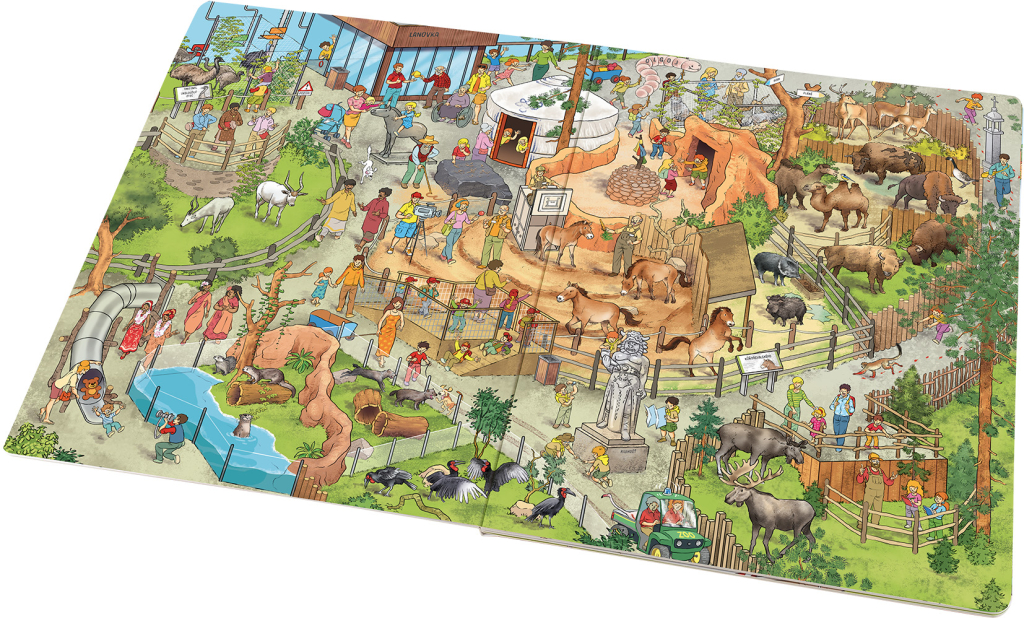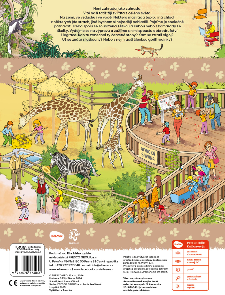 Vítejte v ZOO Praha, jedné z nejkrásnějších zoologických zahrad na světě. Vedle květin, keřů a stromů se tu setkáte hlavně se zvířaty. Pojďte je společně poznávat, třeba se sourozenci Eliškou a Kubou nebo s kamarády ze školky. Vydejte se na dobrodružnou výpravu a zažijte i spoustu legrace. Kdo tu zanechal ty červené stopy? Už se znáte s luskouny? Nebo s nejmladší členkou gorilí rodinky? Prozkoumejte tuhle speciální knížku plnou obrázků důkladněji a zjistíte, že ukrývá spousty příběhů. A mnohé další si děti s pomocí rodičů jistě vymyslí samy. Možná ještě neumějí číst písmenka, ale obrázky umějí číst docela určitě!| EAN | 9788076773035 |