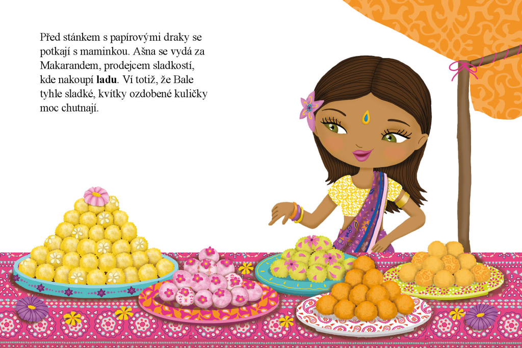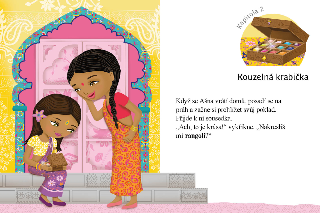 Ašna žije se svými rodiči v Indii. Každý týden pomáhá prodávat na trhu – za odměnu pak dostane peníze, které tu může utratit. Jednoho dne ji upoutá zvláštní stánek, kde se skví hromádky barevných prášků na rangoli, krásné obrazce, které se kreslí na zem před domem, aby nosily štěstí. Ašna si koupí krabičku plnou barevných prášků a začne tvořit nádherné vzory, které se mění v překrásné pestrobarevné látky. A to není všechno, co její kouzelná krabička s prášky dokáže!