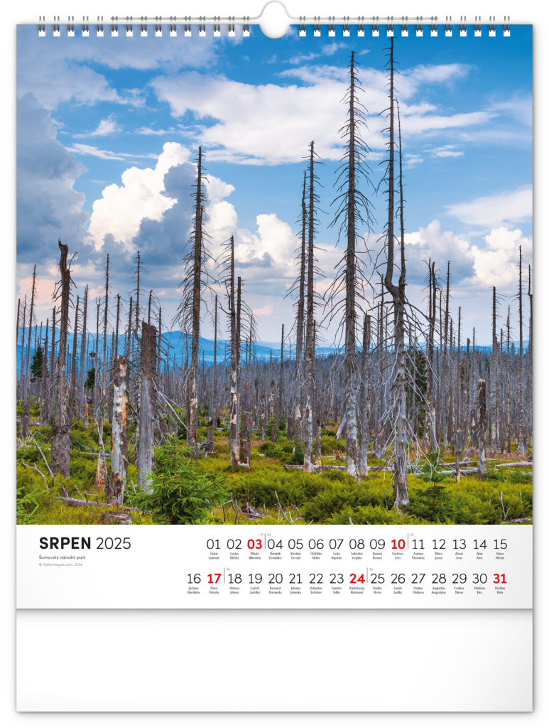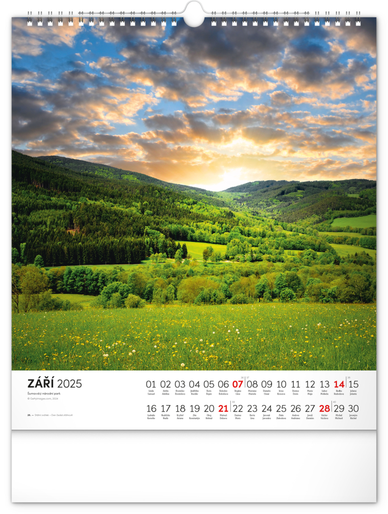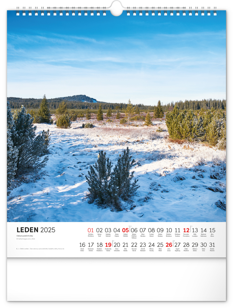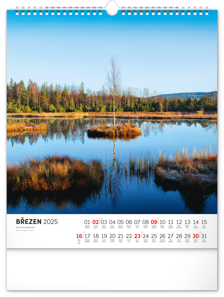 Dvanáct působivých snímků zachycujících krásu Šumavy ve čtvercovém formátu. Fotografie jsou doplněny jednoduchým kalendáriem na bílém pozadí.