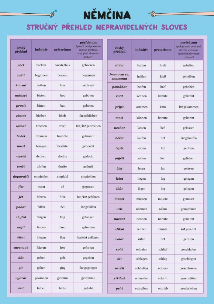 Laminátová kartička určená především pro žáky základních a středních škol nabízí graficky přehledný a stručný přehled těch nejpoužívanějších německých nepravidelných slovech a jejich tvarů.