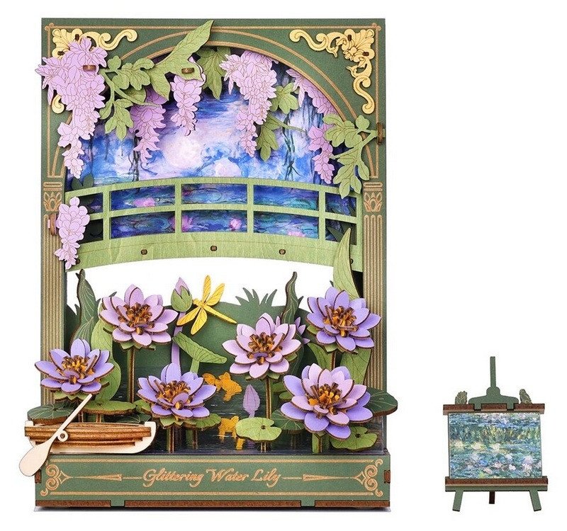 pUžijte si netradiční ztvárnění klasických Monetových maleb prostřednictvím 3D skládačky. Třpytivé lekníny vytvoří po sestavení kouzelnou dekoraci s příjemným teplým osvětlením, která ozdobí každý interiér. Celá scenérie s detailně propracovanými květinami, loďkou a dřevěným můstkem navodí atmosféru klidu a pohody. Decentní LED podsvícení dodává dekoraci magickou atmosféru a připomíná hru světla při západu slunce, tolik typickou pro Monetova díla. Složenou scenérii můžete využít jako noční světlo, doplněk do knihovny nebo originální dárek pro každého, kdo má rád umění a tvoření./pp3D skládačka je skvělý způsob, jak si užít kreativní a edukativní hraní a zároveň vytvořit nádherný model květiny, který se může stát netradičním dárkem či ozdobou Vašeho domova či kanceláře. Skládání podporuje rozvoj jemné motoriky, prostorového myšlení a trpělivosti. Je to možnost, jak kombinovat zábavu se vzděláváním. Skládačka je dodávána v nesloženém stavu, zabalená v krabici s podrobným návodem k sestavení./pp bHlavní vlastnosti:/b brdoba skládání 2 hodinybrLED osvětleníbr2x baterie AAA/LR03/AM4 1,5 V (nejsou součástí balení)brnízká obtížnost sestaveníbrbez použití lepidlabrvýjimečný a realistický vzhledbrvhodné pro děti i dospělébrrozvíjí logické a motorické dovednostibrpodporuje trpělivost dětíbrideální dárek nebo jedinečná dekorace/ppRozměry po sestavení: 16,5 x 8 x 21,5 cmbrRozměry balení: 31,5 x 23,7 x 0,5 cmbrVěk: 14+brMateriál: dřevo, papírbrPočet dílků: 237brDoba sestavení: 2 hodbrNapájení: 2x baterie AAA/LR03/AM4 1,5 V (nejsou součástí balení)/p