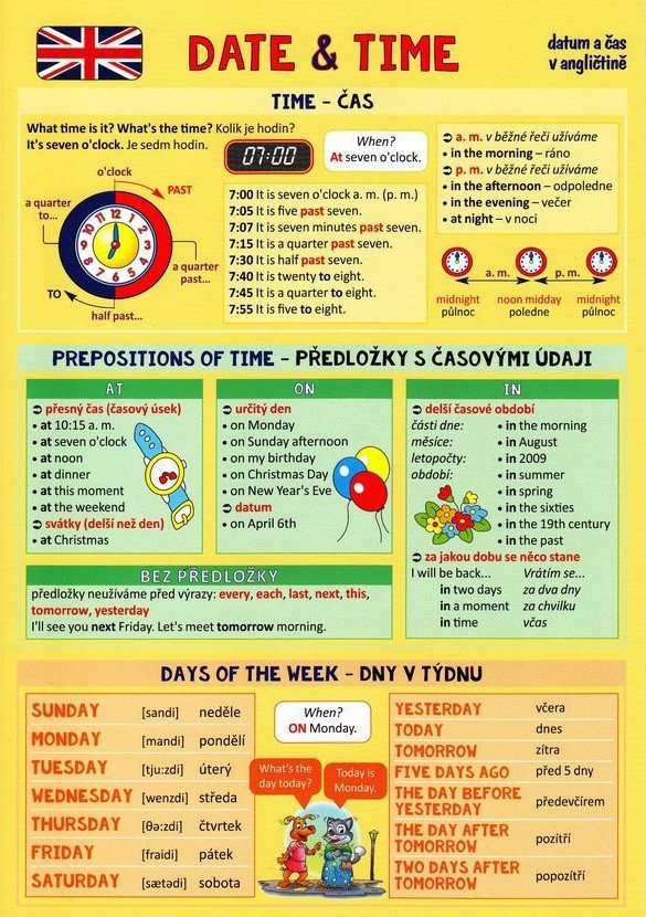 Datum a čas v angličtině, v jedné tabulce, která se vejde do každého sešitu, či notýsku ! Tento malý pomocník se hodí každému angličtináři, bez ohledu na to, jestli je to školák nebo ne!
