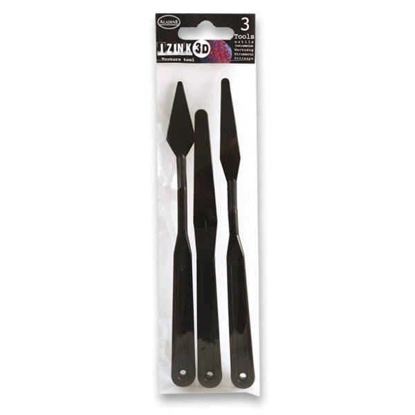 Sada uměleckých špachtlí. Vyrobené z pružného plastu. Špachtle jsou určeny k nanášení past, barev a hmot přes šablonu nebo volně rukou. V balení 3 typy špachtlí.