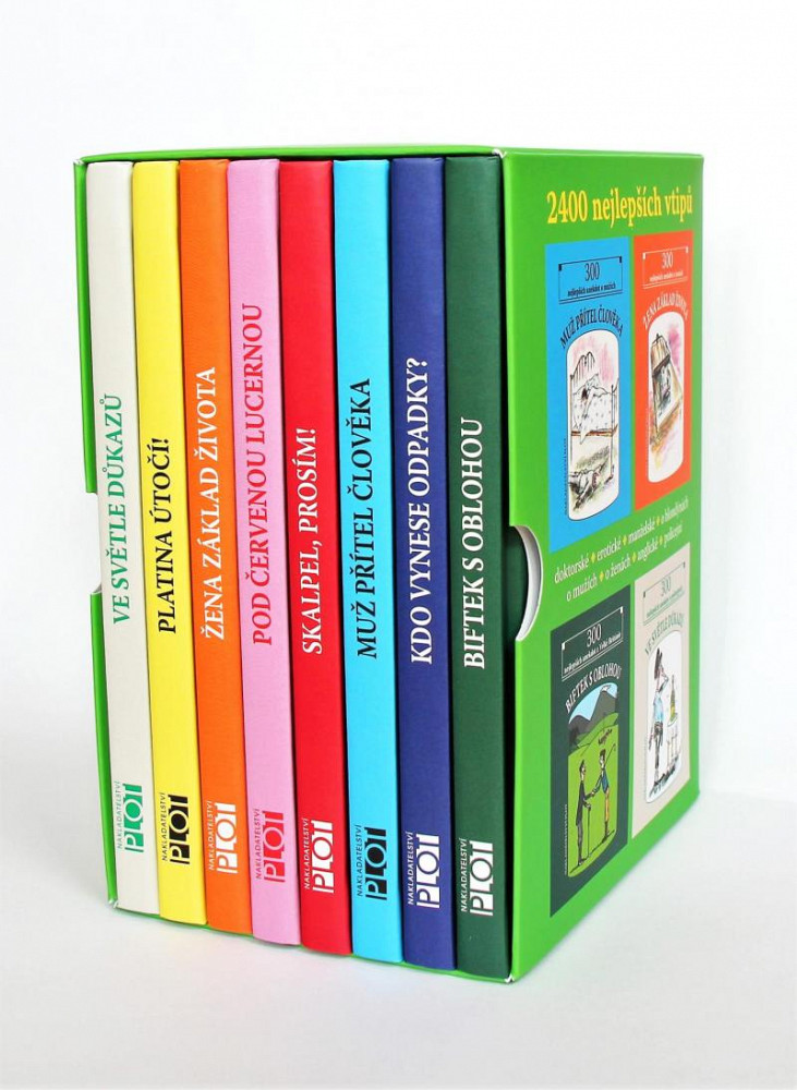 Komplet anekdot obsahuje 8 knížek, ve kterých jsou vtipy doktorské, policejní, erotické, o můžích, o ženách, o blondýnách, ale také anekdoty o manželství a vtipy z Velké Británie.