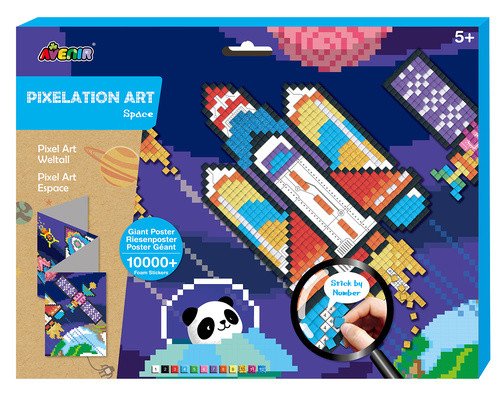 Úžasný obří plakát vytištěný zářivými barvami a vzory z vesmíru. Spojte malé samolepky se správnými očíslovanými čtverečky, abyste dokončili mistrovské dílo.