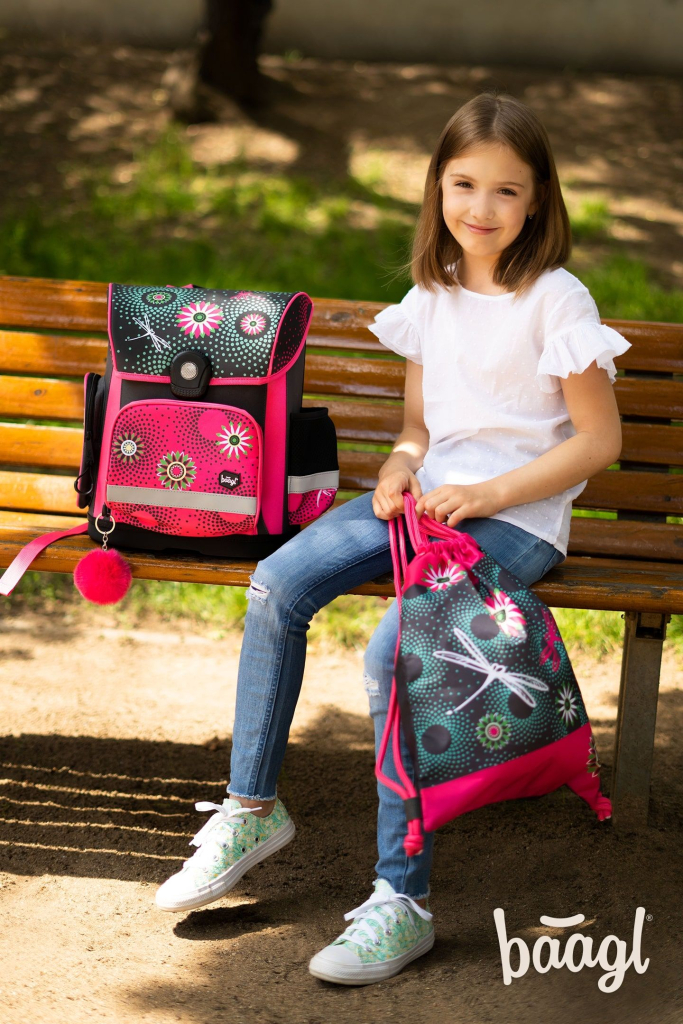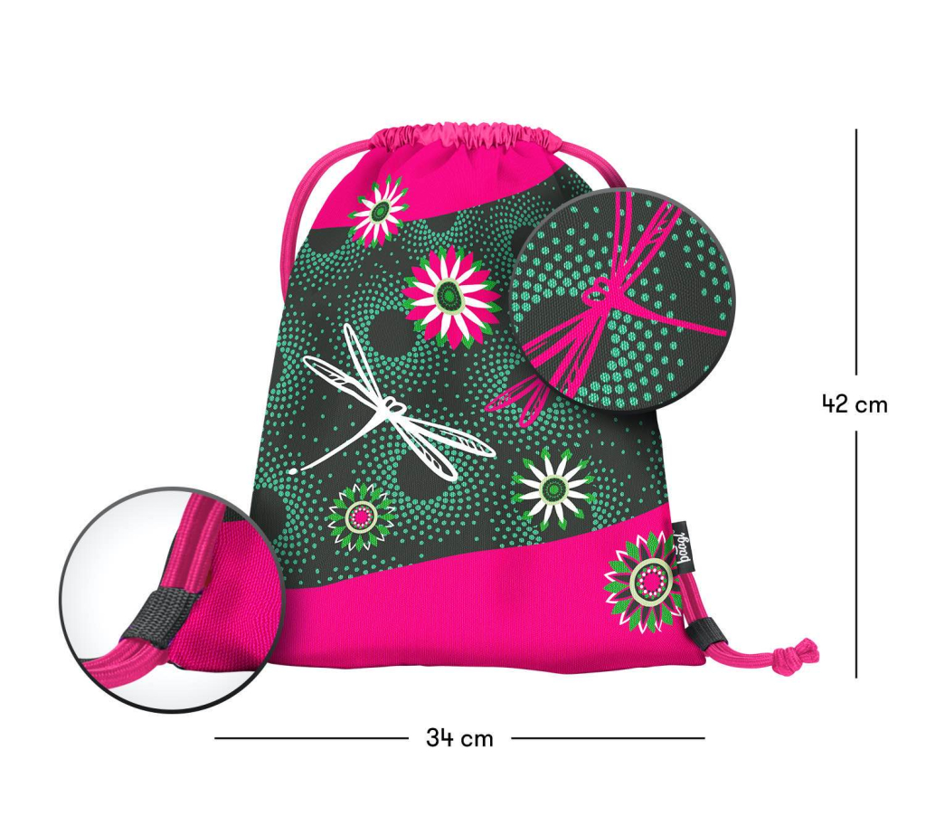 Zeleno-růžový holčičí sáček na obuv s obrázky vážek.