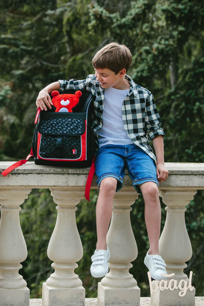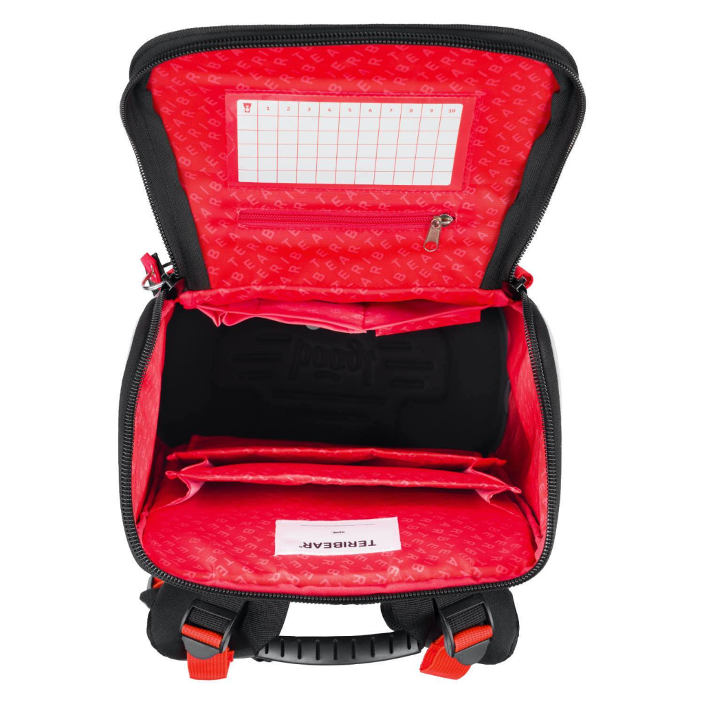 Černo-červená školní aktovka Zippy TERIBEAR s roztomilým plyšovým medvídkem na klopě. Je vhodná pro žáky 1. – 2. třídy ZŠ. Ergonomicky tvarovaná záda, plně nastavitelné ramenní, prsní a boční kompresní popruhy pro optimální přizpůsobení postavě. Aktovka disponuje novým vyklápěcím systémem otevírání, díky kterému se školák snadněji dostane ke svým pomůckám přímo z lavice. Uvnitř aktovky je průhledná kapsa s rozvrhem a vnitřní organizér umožňující rovnoměrné rozložení hmotnosti, doplněný gumičkou pro fixaci. Boční kapsy z pevné síťoviny, které jsou vhodné pro jednu lahev na pití. Izolovaná prostorná přední kapsa se zapínáním na přezku. Lehká konstrukce drží stabilní tvar aktovky, hmotnost aktovky 1 100 g. Objem aktovky je 18 l a nosnost 6 kg. Tělo aktovky je vyrobené z pevného voděodolného materiálu. Dno aktovky je vyrobené z pevného materiálu, díky kterému aktovka samostatně stojí. Reflexní prvky pro bezpečnost dítěte. Aktovka je vybavena praktickou peněženkou. Aktovky z řady ZIPPY byly testovány a certifikovány v akreditované zkušební laboratoři.