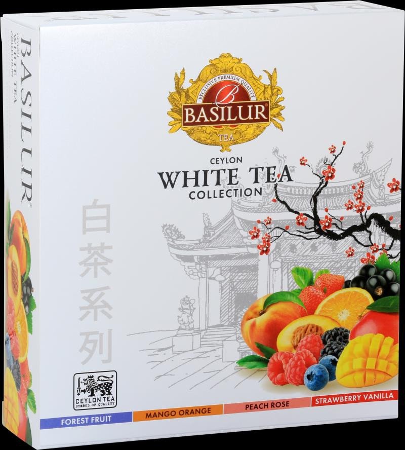 Basilur představuje luxusní kolekci bílého čaje White Tea Collection. Každý z čajů reprezentuje jedinečné vlastnosti a jemnost bílého čaje, mistrovsky namíchaného s lahodnými příchutěmi. Ideální jako dárek a pro povznesení Vašeho každodenního šálku čaje. Bílý čaj, aromatizovaný, porcovaný 40x1,5g. Složení: FOREST FRUIT - bílý čaj, přírodní aroma (lesní ovoce), MANGO ORANGE - bílý čaj, přírodní aroma (mango, pomeranč), PEACH ROSE - bílý čaj, přírodní aroma (broskev, růže), STRAWBERRY VANILLA - bílý čaj, přírodní aroma (jahoda, vanilka). Hmotnost: 60g (40x1,5g). Návod na přípravu: 1 sáček / čajovou lžičku na 250ml šálek, zalít vodou 80°C, louhovat 2-3 minuty. Baleno na Srí Lance.