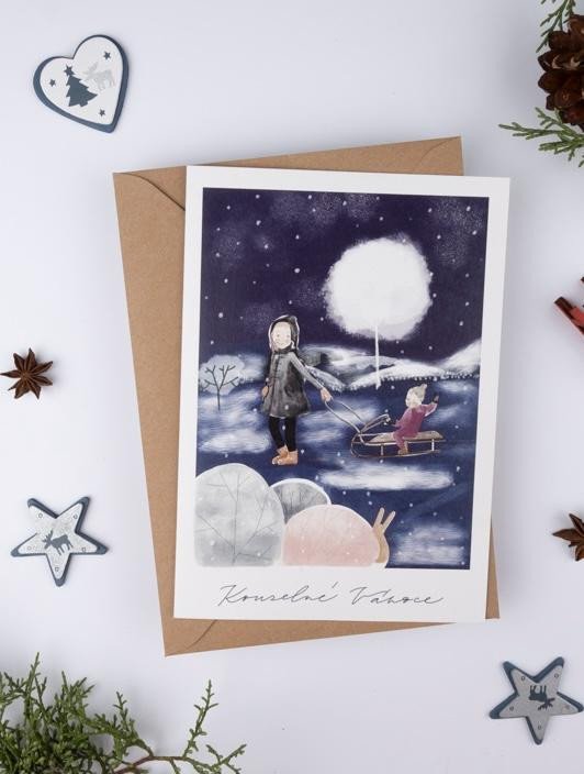 Be Nice EKO vánoční přání z recyklovaného papíru.Také máte rádi zimní procházky, svěží studený vzduch, padající vločky, krajina pod bílým sněhem? Přání Nebeská procházka je inspirovaná právě těmito úžasnými procházkami, které v zimě podnikáme. Uvnitř bez textu. Přání ilustrovala a krasopisně nadepsala česká výtvarnice Bára z Nikolajky. Rozměr: 14,7 x 21 cm