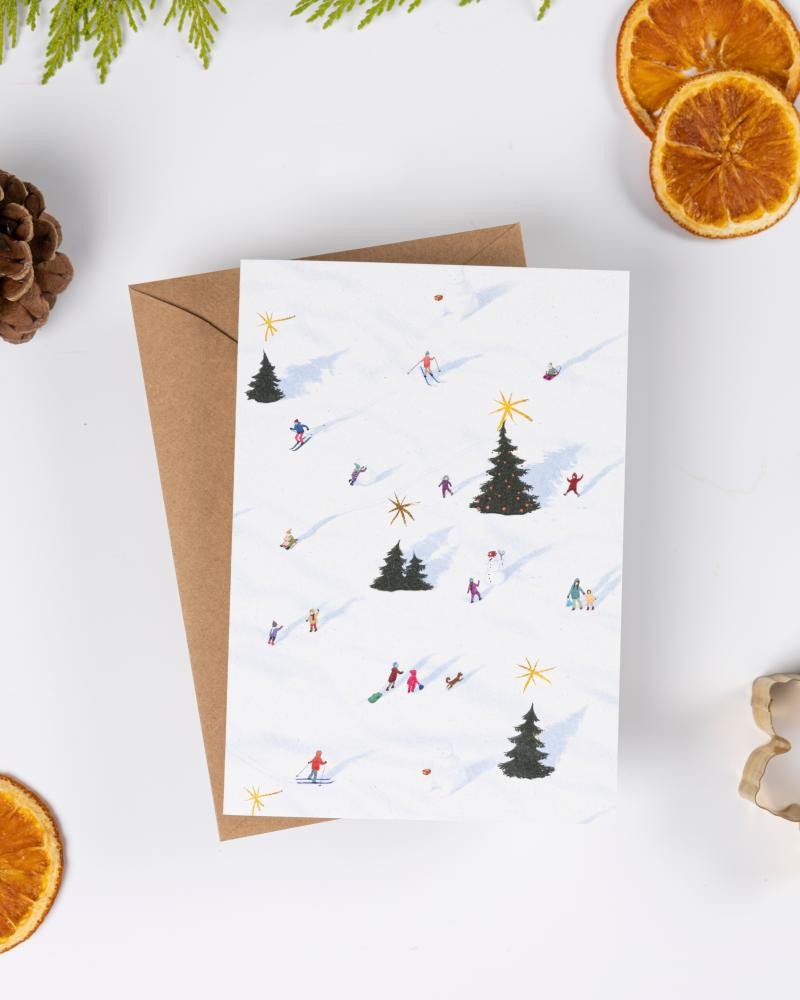 Be Nice EKO vánoční přání z recyklovaného papíru. Zimní radovánky představují vše, co v zimě toužíme dělat. Vyjádřete se skrze krásné zimní přání. Motiv přání vytvořila česká výtvarnice Lela Geislerová. Rozměr: 12 x 17 cm