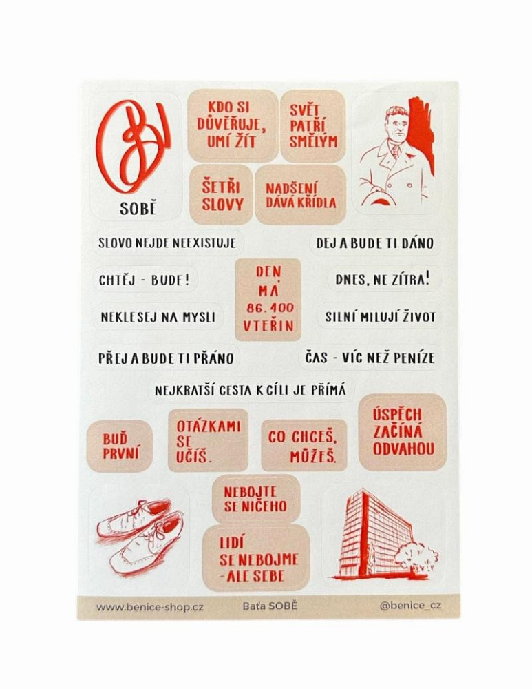 Be Nice motivační samolepky s citáty úspěšného českého podnikatele Tomáše Bati.
