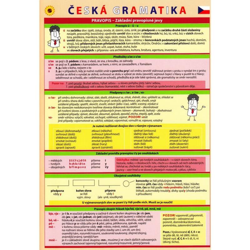 S tímto přehledem přehledem České gramatiky se seznámíte se základními pravopisnými jevy jazyka českého. S touto tabulkou češtinu zvládnete hravě. Rozložitelná tabulka, která se vejde do každého sešitu, či notýsku ! Tento malý pomocník se hodí každému, bez ohledu na to, jestli je to školák nebo ne!