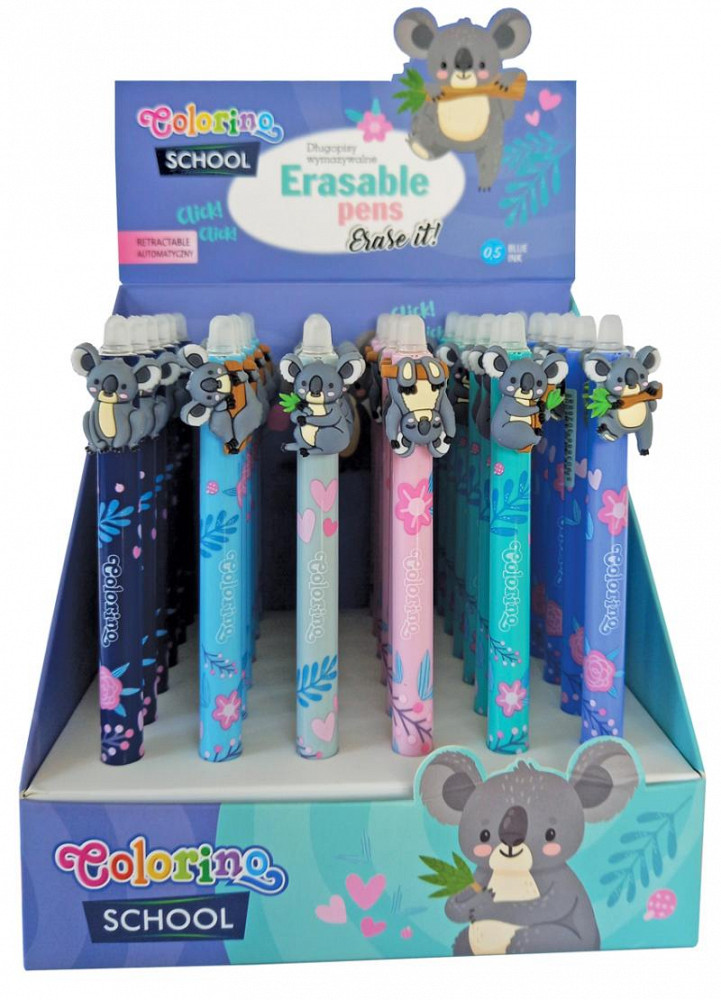 Praktická gumovatelná pera pro děti s motivy roztomilých koal. Kvalitní inkoust lze v případě potřeby jednodušše vygumovat a přepsat. 6 různých motivů, barva náplně: modrá , šířka stopy: 0,5 mm, stiskací mechanika, dostupná náhradní náplň.