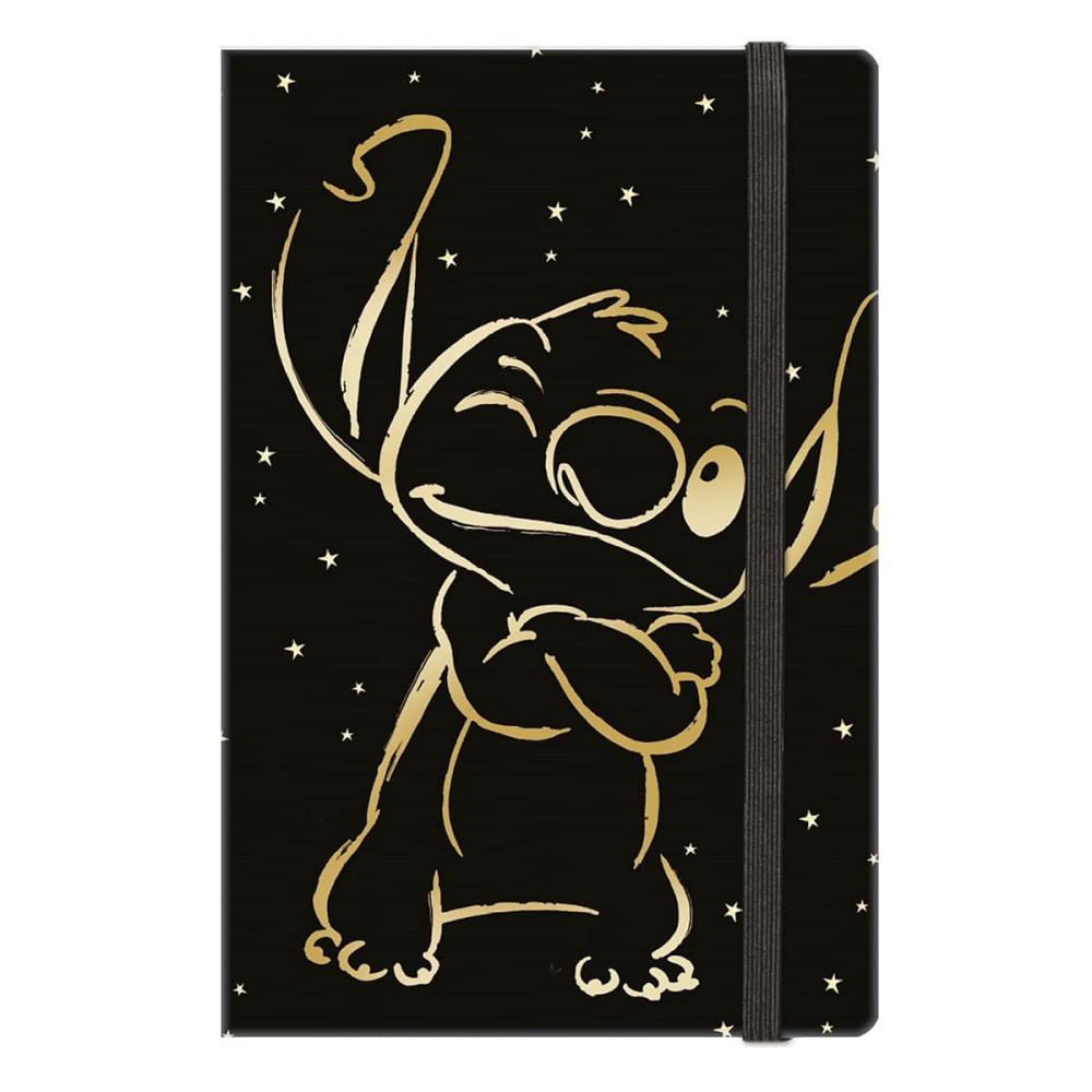 Zápisník v pevných deskách, s fixační plochou gumičkou. Vhodný pro každodenní poznámky, denní úkoly nebo jako deník. Linkovaný bělený papír s drobnou dekorací Stitche v pravém spodním rohu.