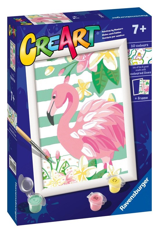 CreArt - to je kreativní zábava doslova pro každého. Staňte se na chvíli profesionálním malířem a namalujte si svůj vlastní obraz. Tento nádherný růžový plameňák rozzáří každou zeď. Postupně vybarvujte jednotlivé plochy podle návodu (každé číslo na plátně odpovídá jedné konkrétní barvě) a dopřejte si radost z tvůrčí práce, u které se zabavíte na dlouhé hodiny. Malování je skvělá činnost, která nejen baví, ale také procvičuje zručnost, zlepšuje koncentraci a zaručuje spokojenost a pocit hrdosti všem umělcům. Set obsahuje vše, co potřebujete k malování: vysoce kvalitní, pevné plátno s obrazovou předlohou s očíslovanými plochami, sadu akrylových barev, štětec, kartonový stojánek pro kelímky s barvami a rámeček. Vykreslené plochy vytváří profesionálně vypadající umělecké dílo. Jakmile obraz dokončíte, nechte ho zaschnout a zarámujte ho do rámečku, který je součástí balení. Malování nikdy nebylo tak jednoduché.