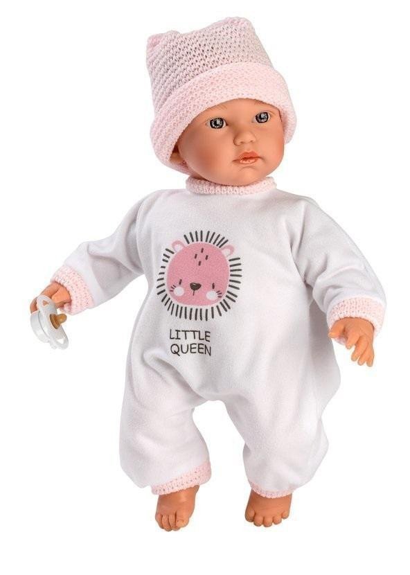 Mluvící miminko s měkkým látkovým tělem, které po zatlačení na hrudník začne říkat „mama“, „papa“ a vydávat reálný zvuk plačícího miminka. Velikost 30 cm. Součástí balení je 3 x knoflíková baterie LR44.