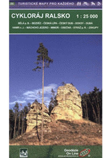 Cykloráj Ralsko 1 : 25 000, turistická a cykloturistická mapa; Bělá p.B. - Bezděz - Česká Lípa - Český Dub - Doksy - Dubá - Hamr n.J. - Máchovo jezero - Mimoň - Osečná - Stráž p.R. - Zákupy. Mapy 1:25 000 od společnosti Geodezie On-Line. Podrobná mapa zobrazuje základní polohopisné a výškopisné informace např. silnice, zpevněné a nezpevněné cesty,železnici, sídla a jejich části včetně osad a samot, vodní plochy a toky, ostatní plochy (např. lesy, zahrady a sady, vinice, chmelnice), výškové kóty, vrstevnice po 10 m, ... Mapa dále obsahuje pásové a místní turistické značení, turistické směrovníky, kilometráž; cykloturistické trasy; naučné stezky; turistické lyžařské trasy, sjezdové tratě, lanovky a vleky; jezdecké trasy a samozřejmě zobrazuje pro turisty atraktivní místa - hrady a zámky, rozhledny a místa rozhledu, zříceniny a jiné památky, muzea a galerie, koupaliště, vybrané restaurace a ubytovací zařízení,...