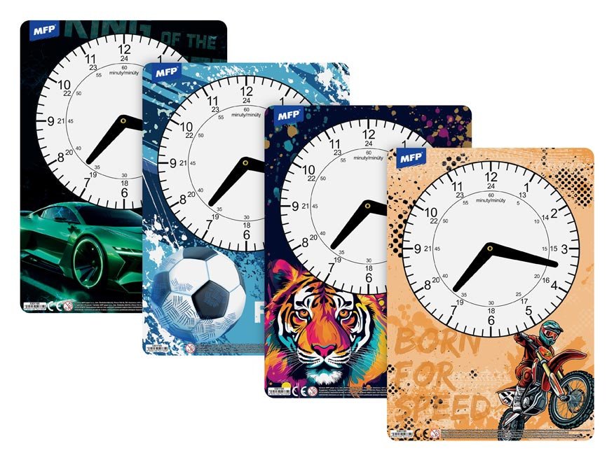 Dětské papírové hodiny v mixu chlapeckých motivů. Didaktická pomůcka, dobře využitelná k výuce času u dětí předškolního věku nebo u prvňáčků. Tyto cvičné hodiny nesmí chybět Vašemu dítěti při nástupu do první třídy základní školy.