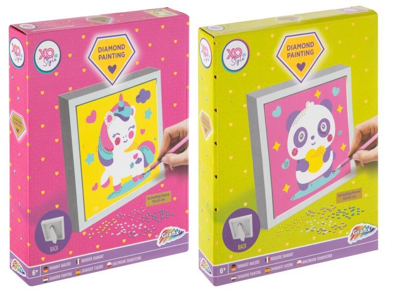 Malování pomocí kamínků Diamond s rámečkem 15×15 cm. V balení obsahuje obrázek, rámeček, aplikátor, misku na kamínky a 5 barev kamínků. Dva druhy – jednorožec a panda.
