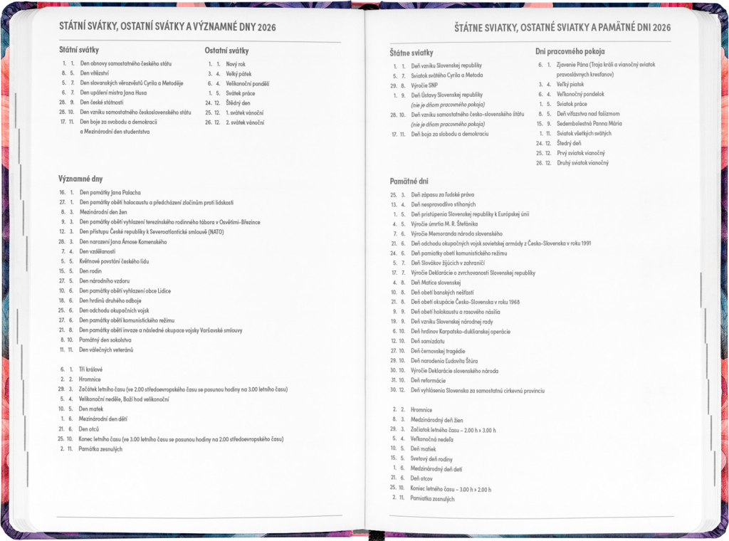 Osmnáctiměsíční diář obsahuje přehled na rok 2025 a 2026, seznam českých a slovenských jmen, česko-slovenské týdenní řádkové kalendárium se jmény a svátky a prostor na poznámky. Kalendárium začíná v červenci 2025 a končí v prosinci 2026.