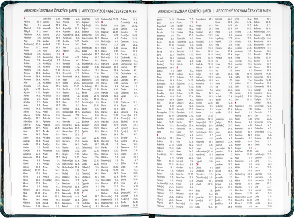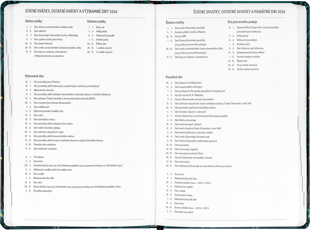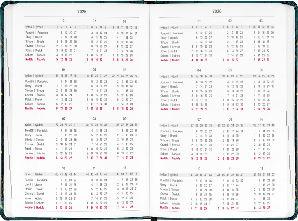 Osmnáctiměsíční diář obsahuje přehled na rok 2025 a 2026, seznam českých a slovenských jmen, česko-slovenské týdenní řádkové kalendárium se jmény a svátky a prostor na poznámky. Kalendárium začíná v červenci 2025 a končí v prosinci 2026.