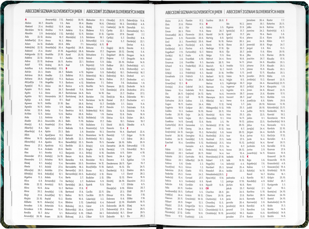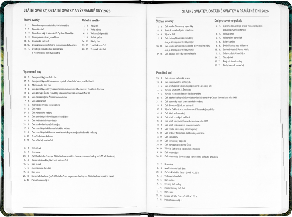 Osmnáctiměsíční diář obsahuje přehled na rok 2025 a 2026, seznam českých a slovenských jmen, česko-slovenské týdenní řádkové kalendárium se jmény a svátky a prostor na poznámky. Kalendárium začíná v červenci 2025 a končí v prosinci 2026.