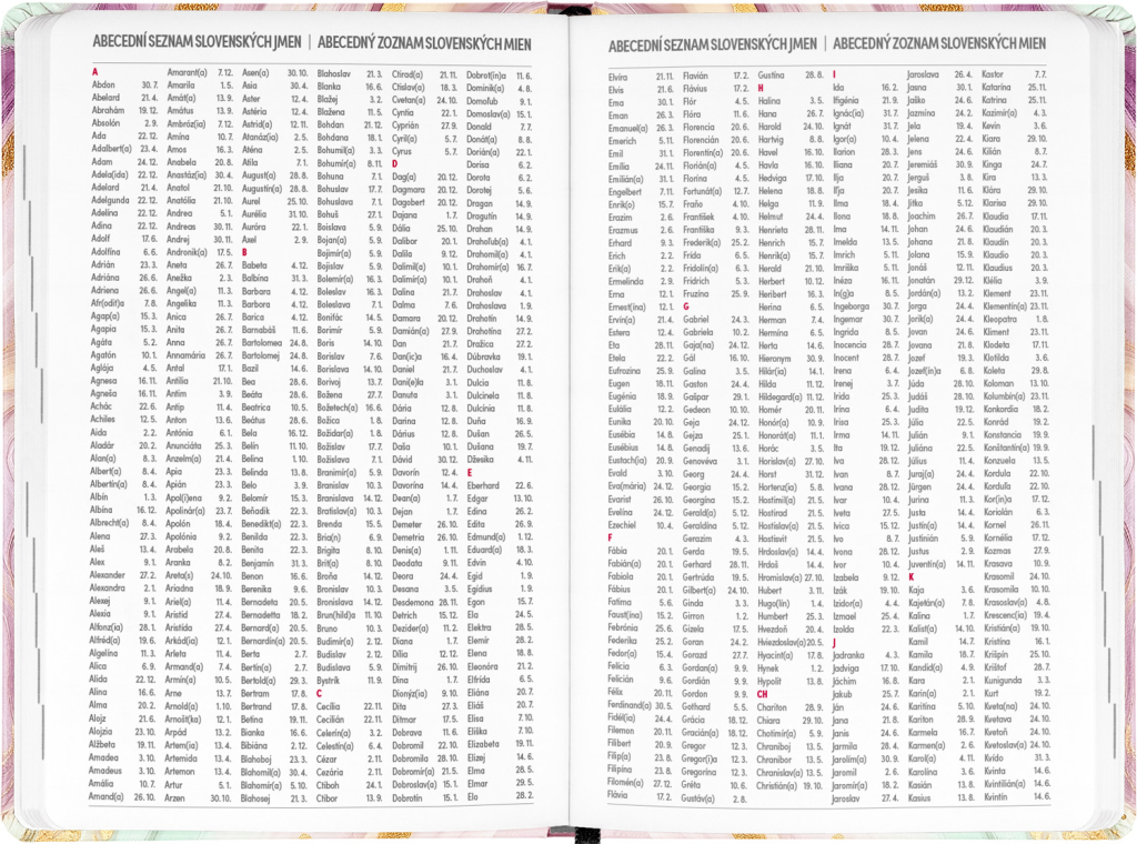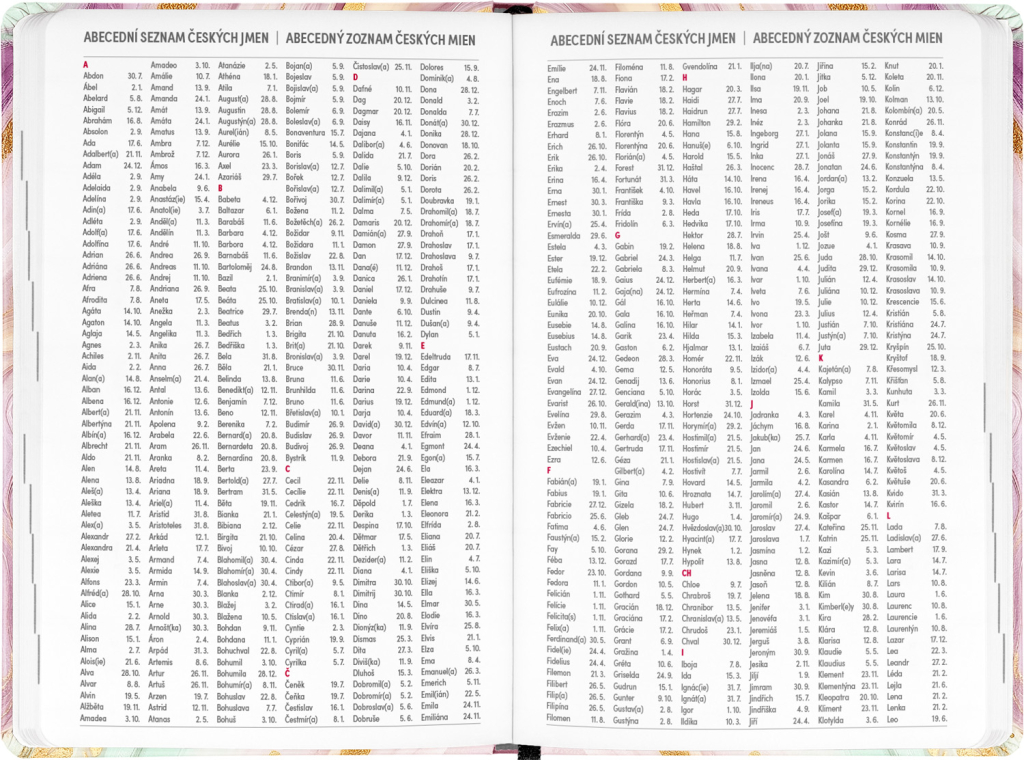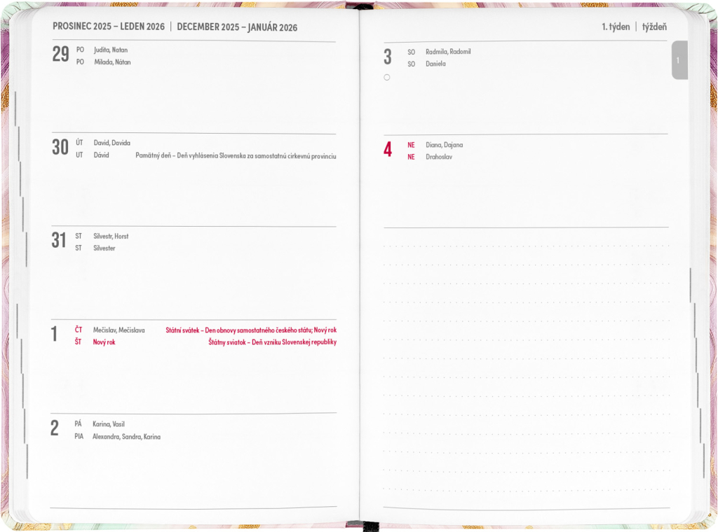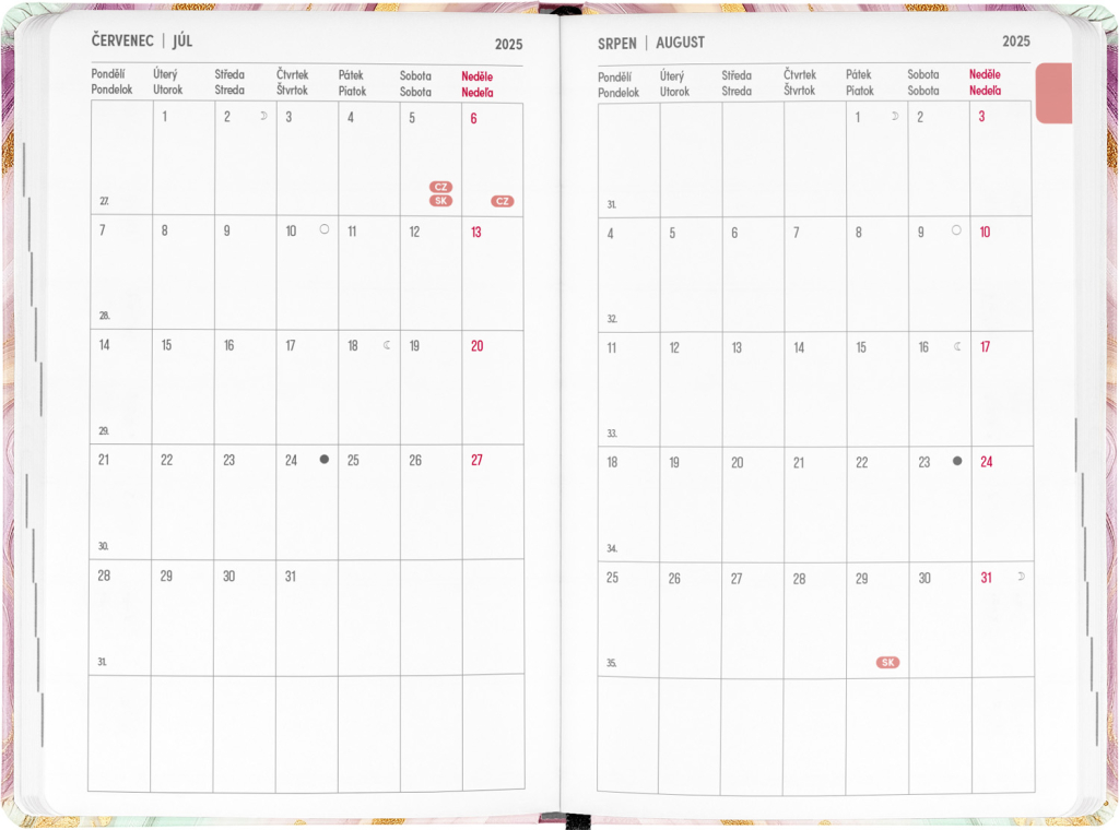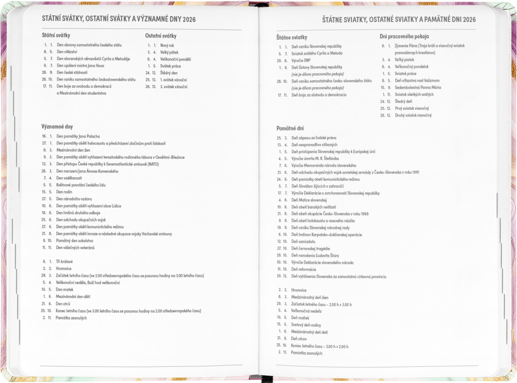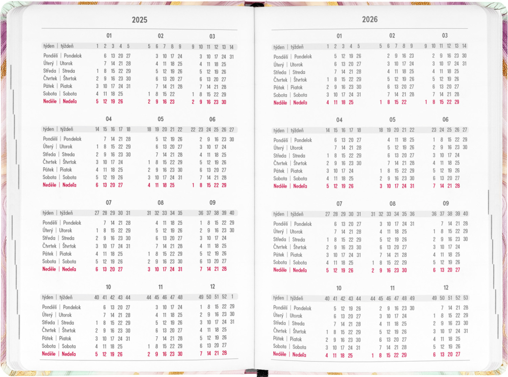 Osmnáctiměsíční diář obsahuje přehled na rok 2025 a 2026, seznam českých a slovenských jmen, česko-slovenské týdenní řádkové kalendárium se jmény a svátky a prostor na poznámky. Kalendárium začíná v červenci 2025 a končí v prosinci 2026.