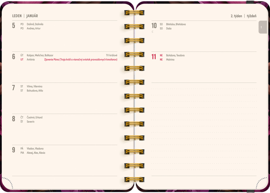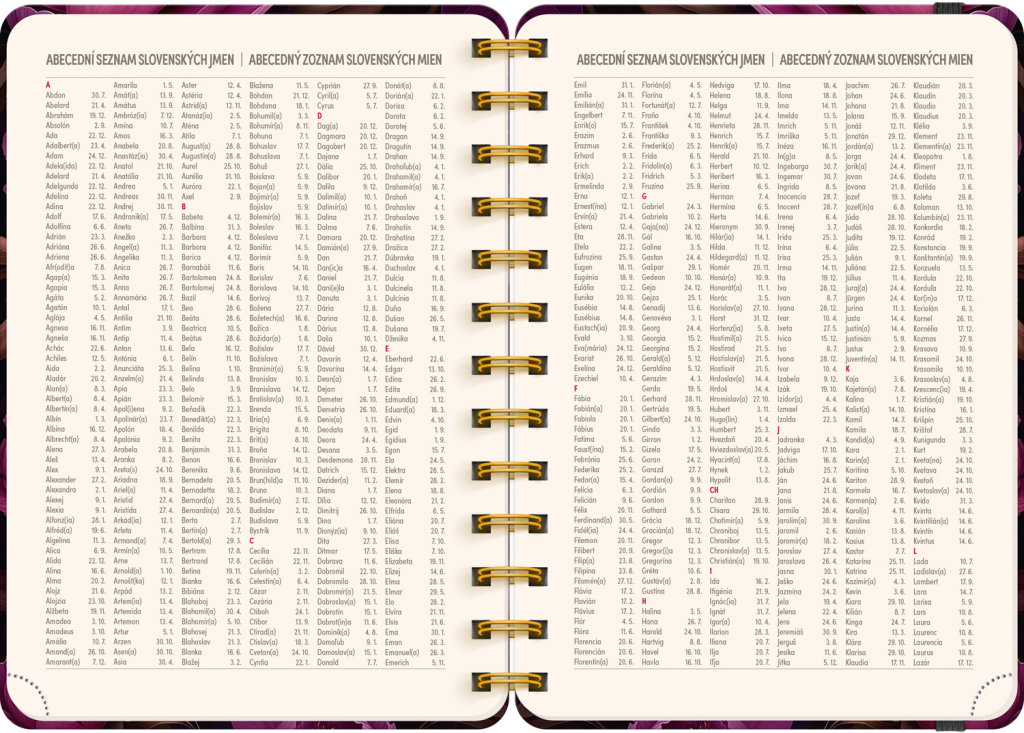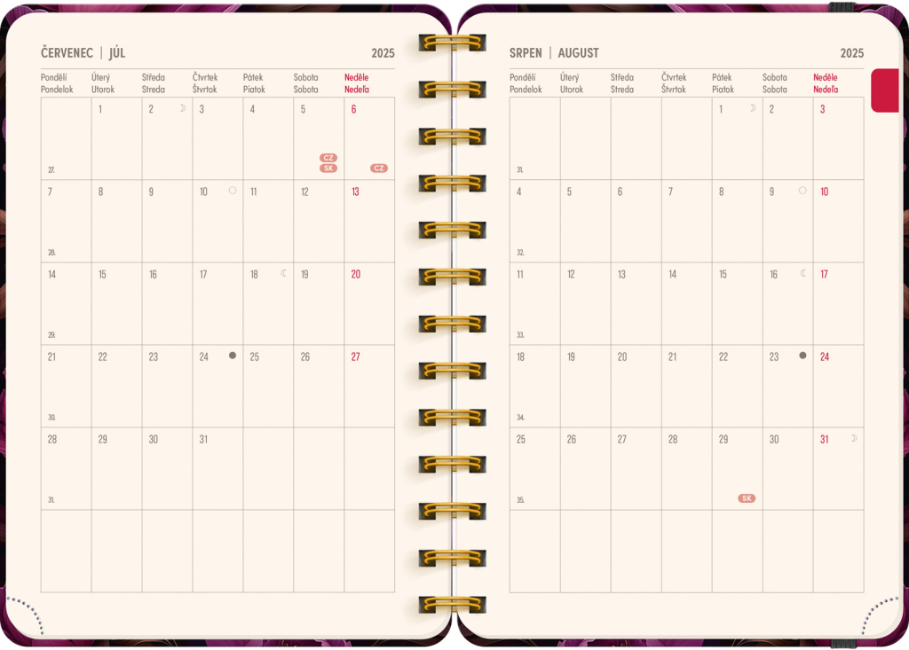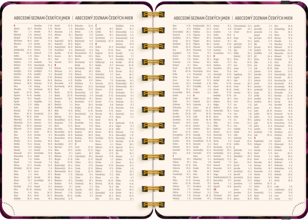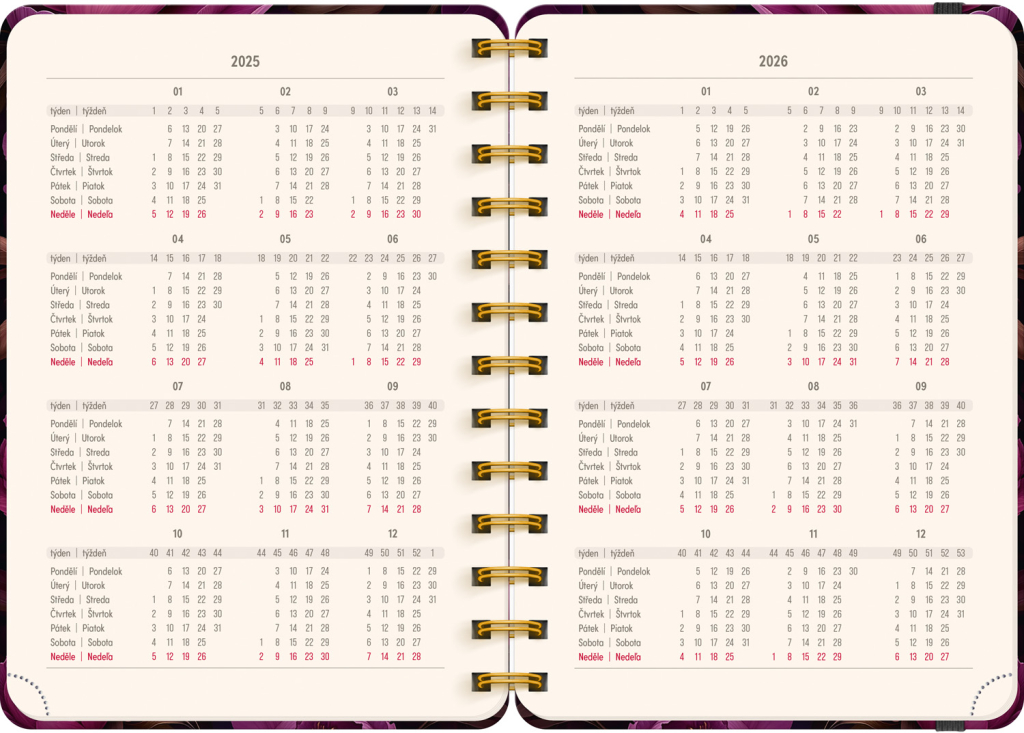 Osmnáctiměsíční diář obsahuje přehled na rok 2025 a 2026, seznam českých a slovenských jmen, česko-slovenské týdenní řádkové kalendárium se jmény a svátky a prostor na poznámky. Kalendárium začíná v červenci 2025 a končí v prosinci 2026.
