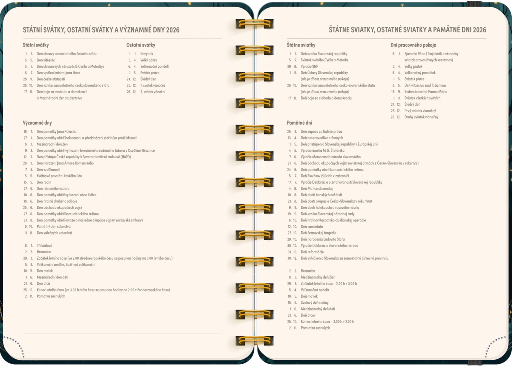 Osmnáctiměsíční diář obsahuje přehled na rok 2025 a 2026, seznam českých a slovenských jmen, česko-slovenské týdenní řádkové kalendárium se jmény a svátky a prostor na poznámky. Kalendárium začíná v červenci 2025 a končí v prosinci 2026.