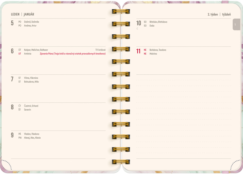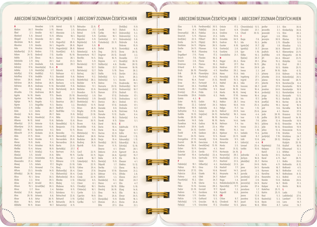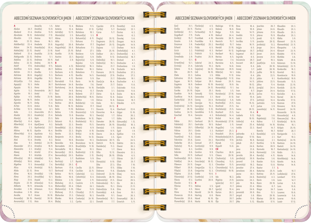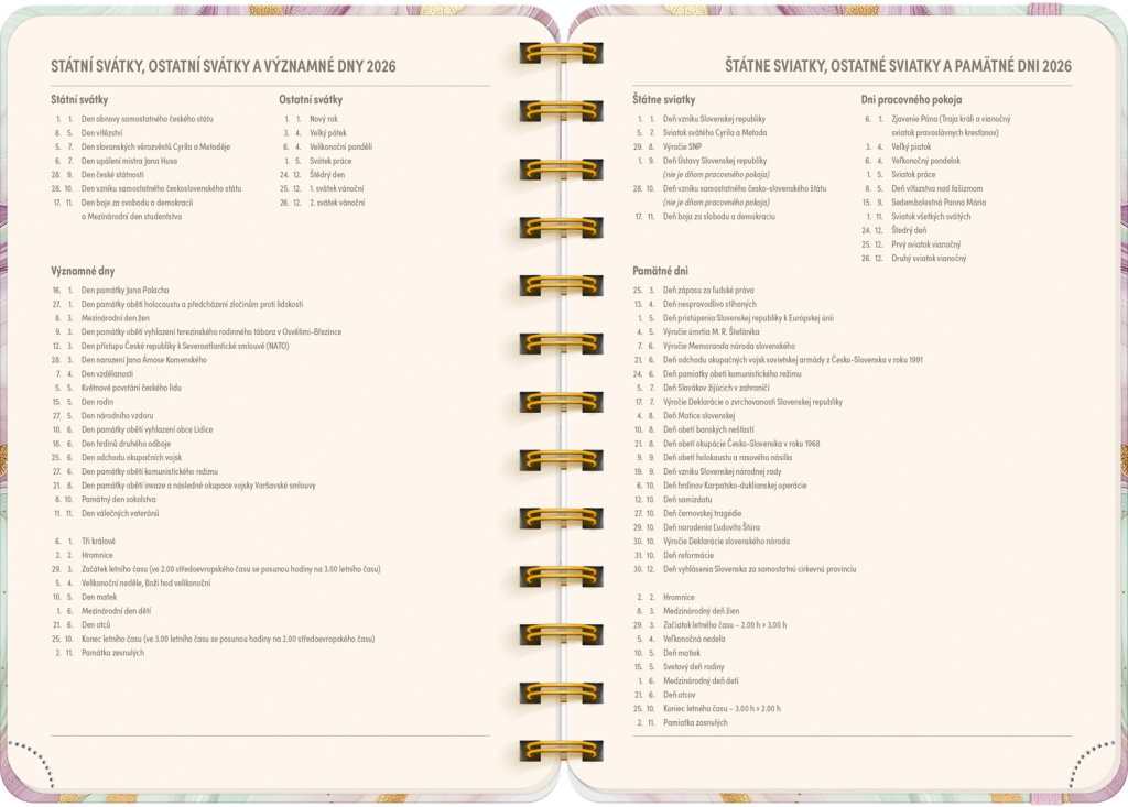 Osmnáctiměsíční diář obsahuje přehled na rok 2025 a 2026, seznam českých a slovenských jmen, česko-slovenské týdenní řádkové kalendárium se jmény a svátky a prostor na poznámky. Kalendárium začíná v červenci 2025 a končí v prosinci 2026.