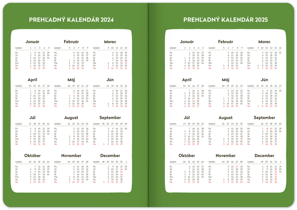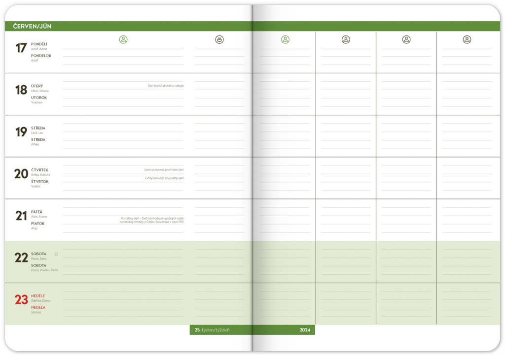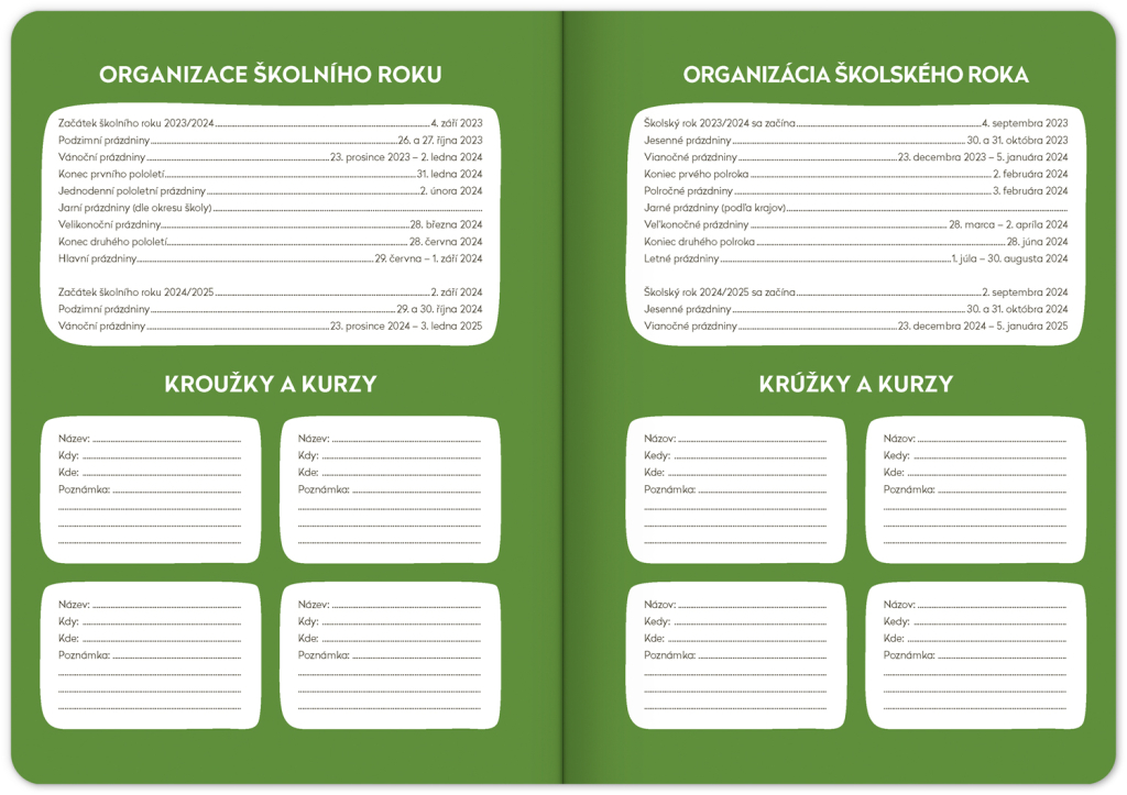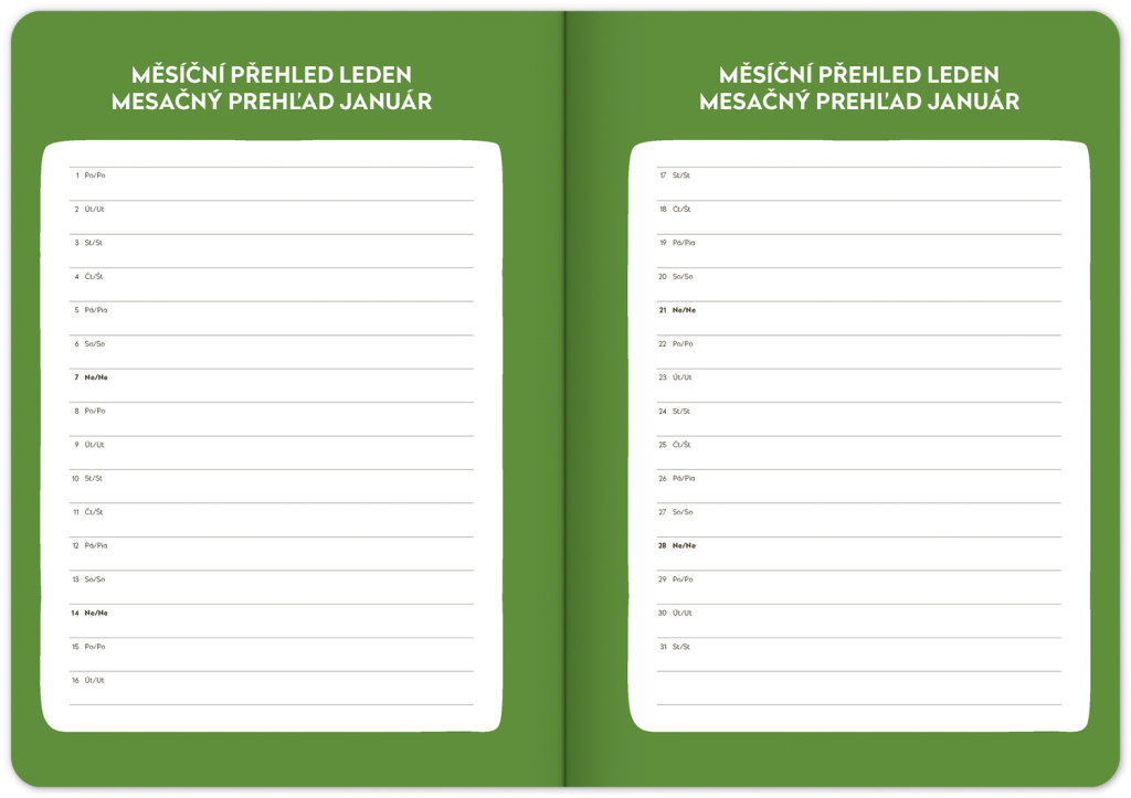 Praktický diář je pomocníkem pro plánování aktivit rodiny a chodu domácnosti. Rozdělen je do týdenních cyklů, ve kterých můžete sledovat a zapisovat úkoly jednotlivých rodinných příslušníků do připravených sloupců. Nechybí rovněž rozvrh hodin pro školáky, seznamy na nákup a prostor pro všechny důležité poznámky.