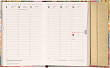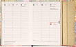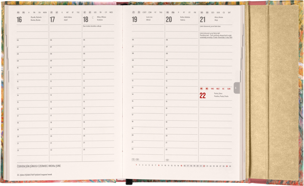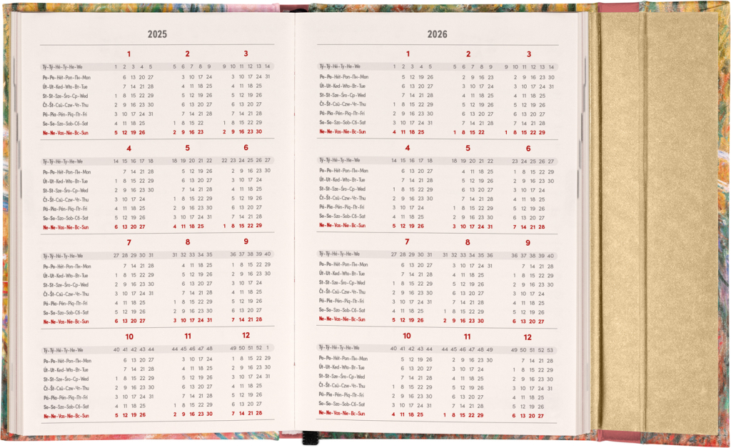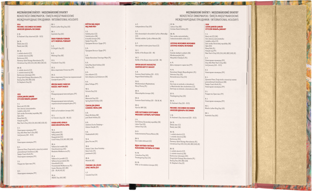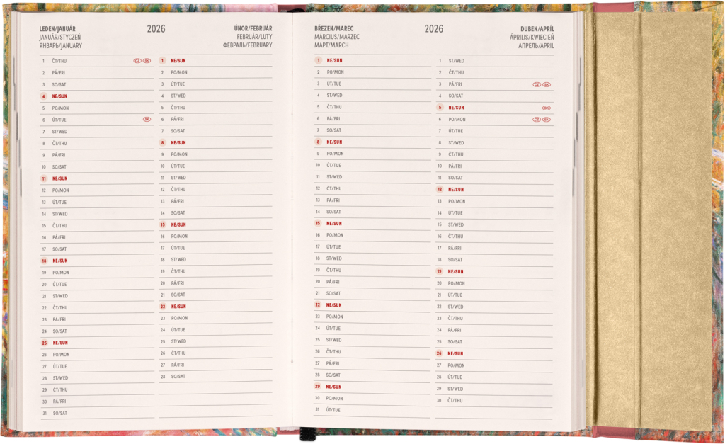 Šestijazyčný týdenní diář s magnetickým uzavíráním obsahuje přehled mezinárodních svátků, seznam českých a slovenských jmen, přehled roku 2025 a 2026, dodatečné stránky na poznámky a kapsičku na zadní předsádce. Sloupcové rozvržení s prostorem pro poznámky na každý den. Diář je v designu díla Clauda Moneta.