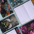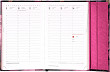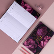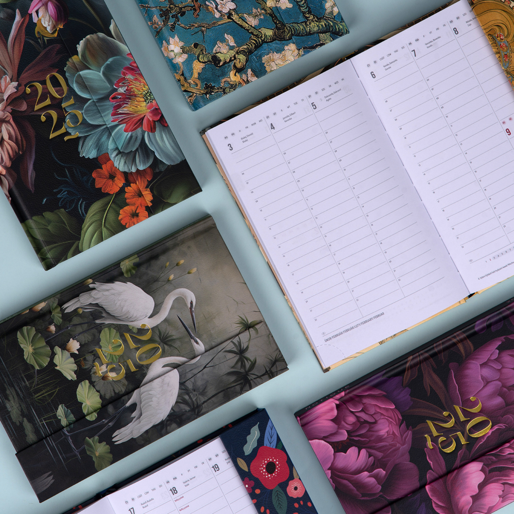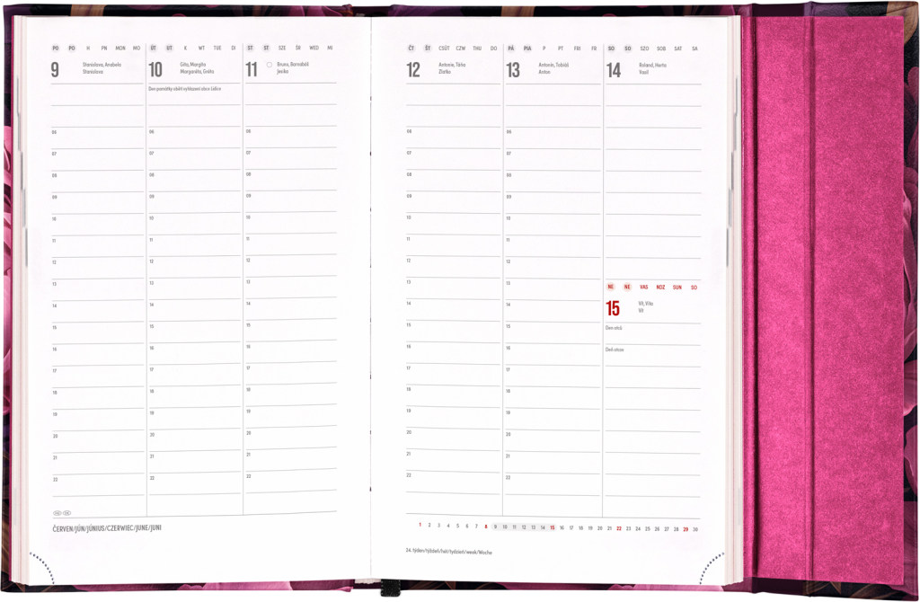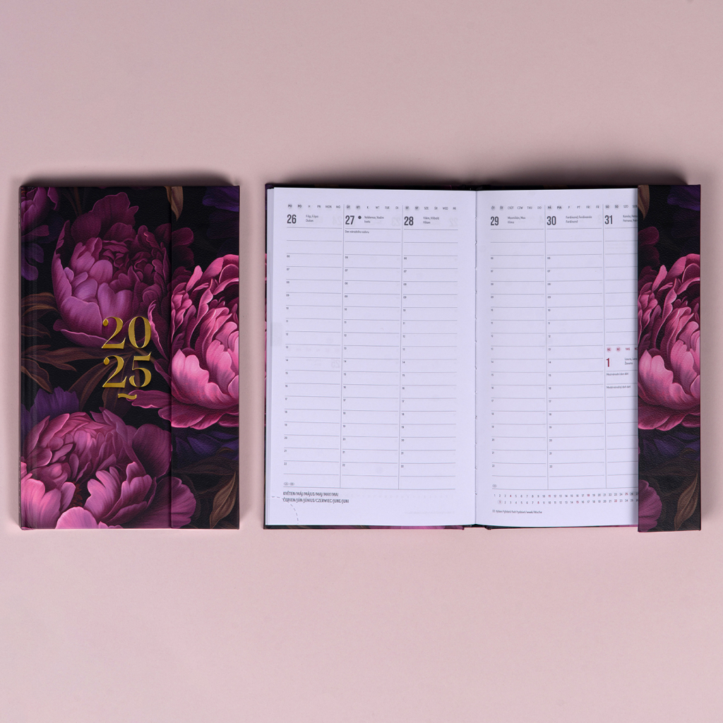 Šestijazyčný týdenní diář s magnetickým uzavíráním obsahuje přehled mezinárodních svátků, seznam českých a slovenských jmen, přehled roku 2025 a 2026, dodatečné stránky na poznámky a kapsičku na zadní předsádce. Sloupcové rozvržení s prostorem pro poznámky na každý den. Diář je v designu s motivem fialových květů.