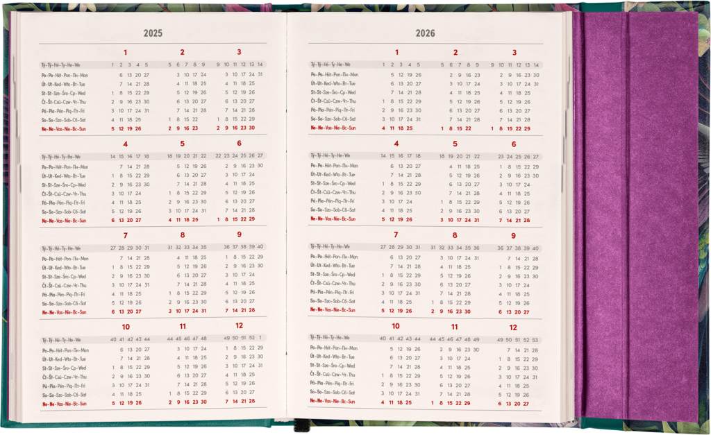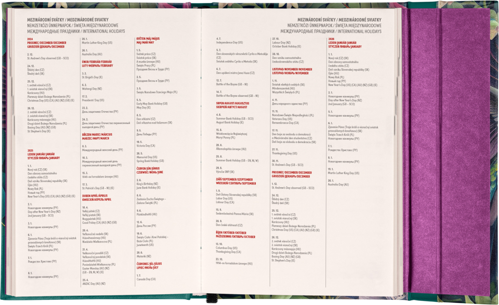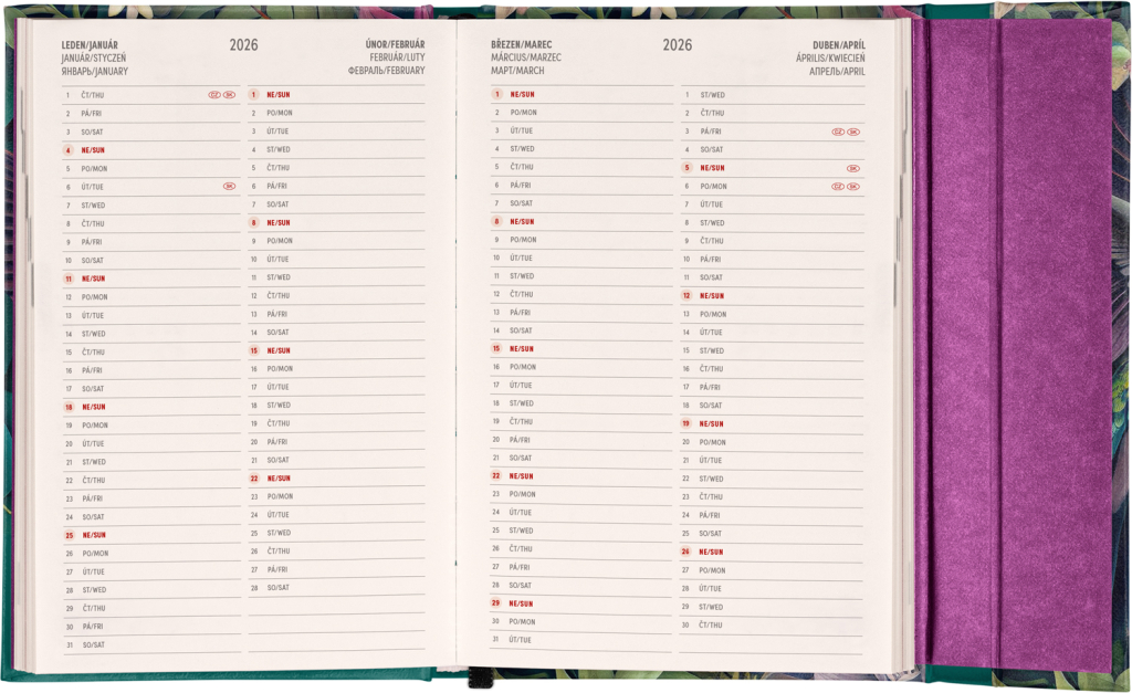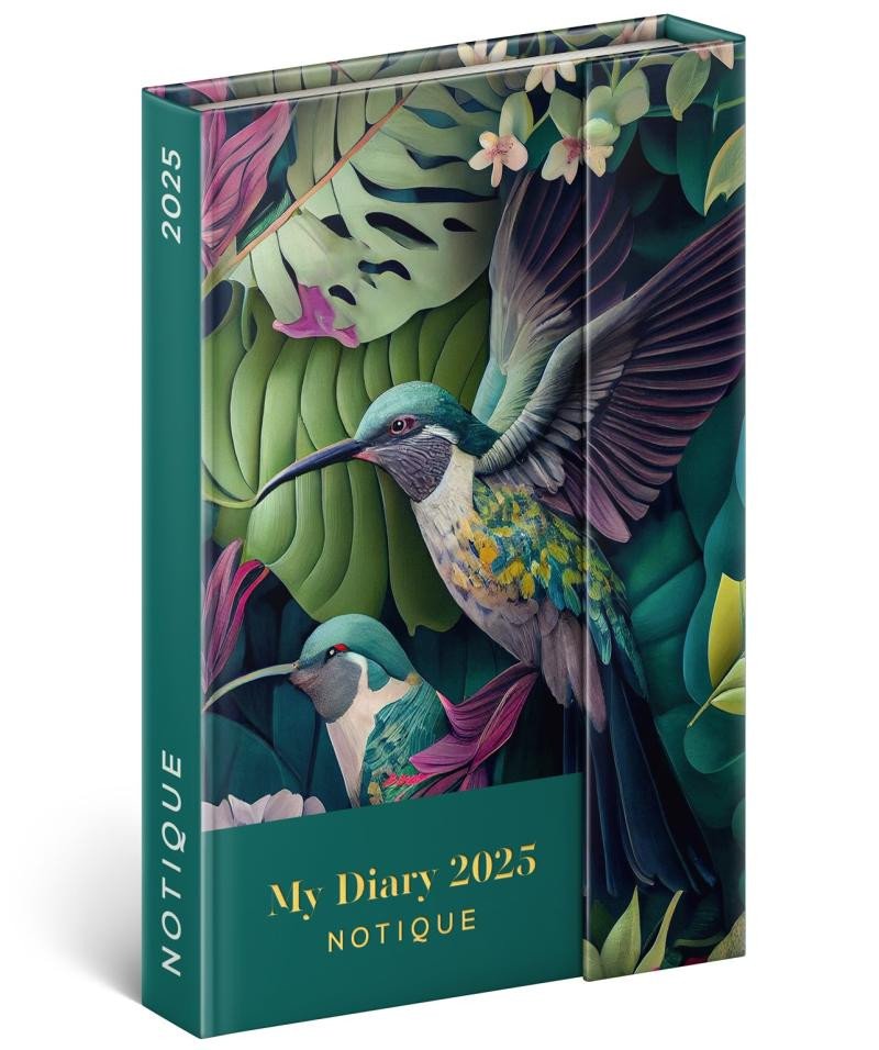 Šestijazyčný týdenní diář s magnetickým uzavíráním obsahuje přehled mezinárodních svátků, seznam českých a slovenských jmen, přehled roku 2025 a 2026, dodatečné stránky na poznámky a kapsičku na zadní předsádce. Sloupcové rozvržení s prostorem pro poznámky na každý den. Diář je v atraktivním designu s motivem kolibříků.