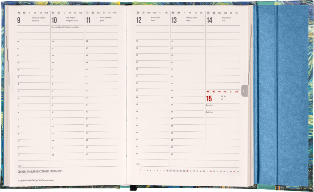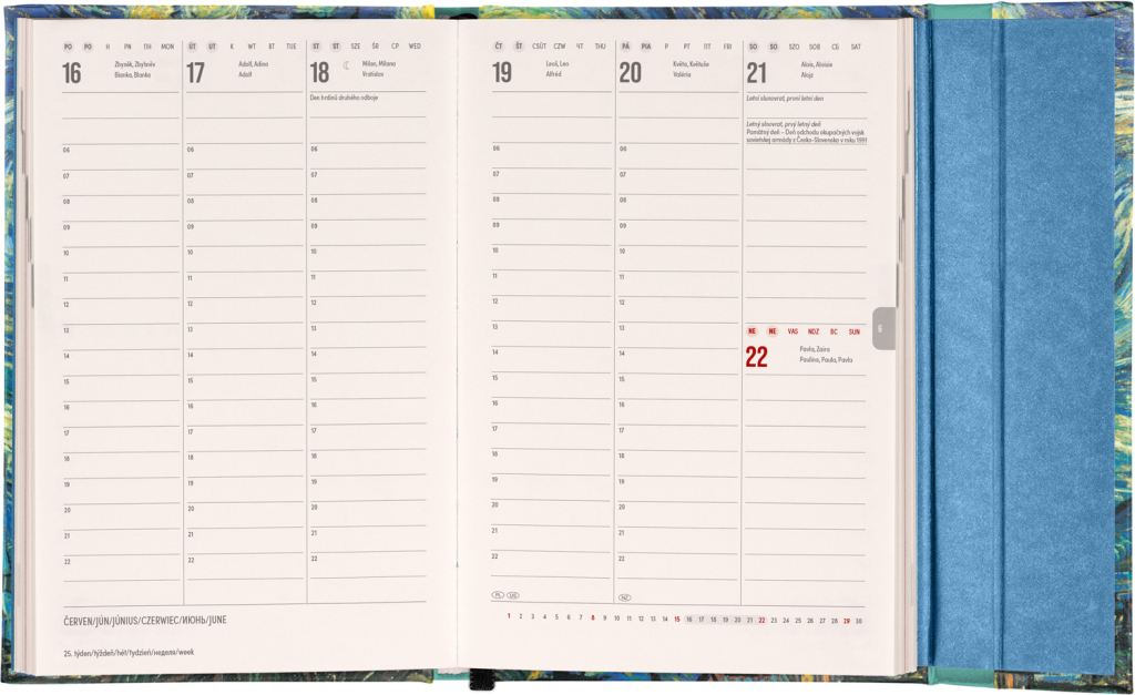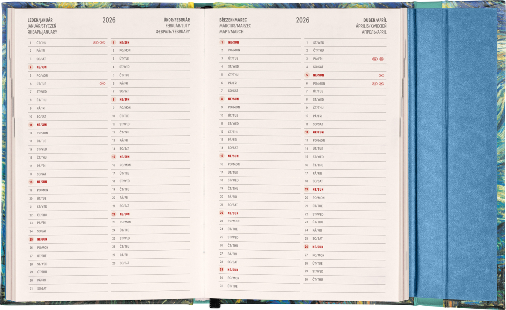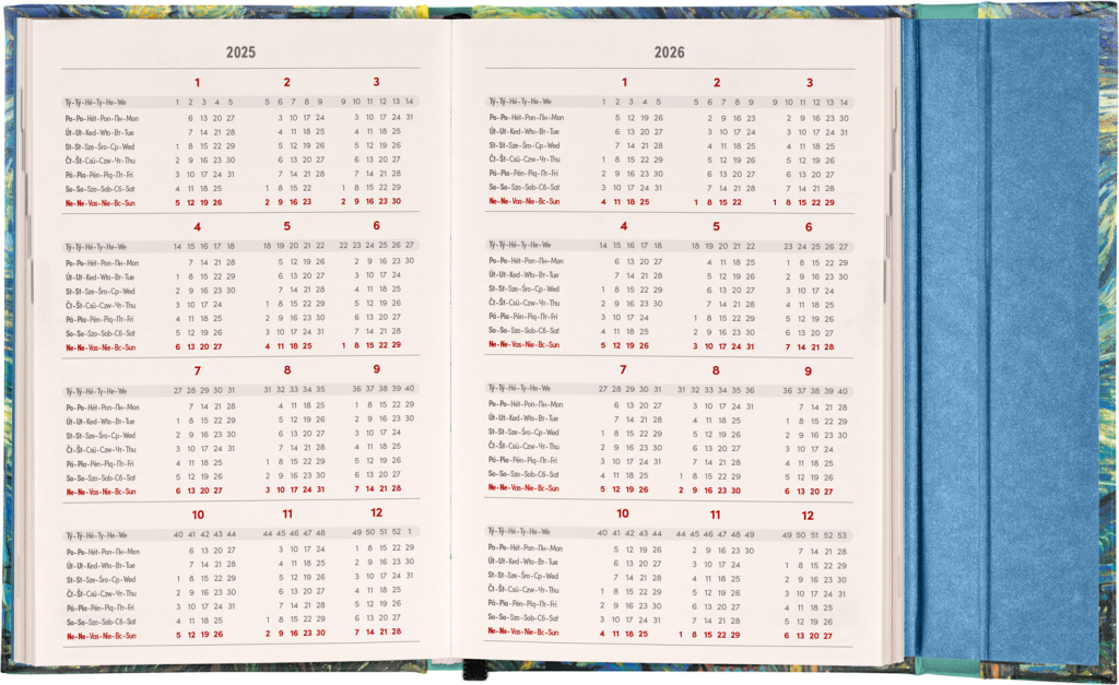 Šestijazyčný týdenní diář s magnetickým uzavíráním obsahuje přehled mezinárodních svátků, seznam českých a slovenských jmen, přehled roku 2025 a 2026, dodatečné stránky na poznámky a kapsičku na zadní předsádce. Sloupcové rozvržení s prostorem pro poznámky na každý den. Diář je v designu obrazu Vincenta van Gogha.