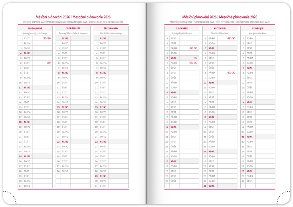 Týdenní diář Ajax 2026 v černé barvě. Jemně strukturovaný povrch s atypickým reliéfem je vhodný pro všechny typy ražeb. Diář má zakulacené rohy, poutko na tužku a elastickou gumičku. Týdenní rozvrh s česko-slovenským kalendáriem a doplňkovou angličtinou, němčinou, maďarštinou a ruštinou.