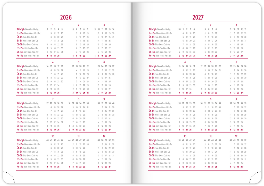 Týdenní diář Ajax 2026 v modré barvě. Jemně strukturovaný povrch s atypickým reliéfem je vhodný pro všechny typy ražeb. Diář má zakulacené rohy, poutko na tužku a elastickou gumičku. Týdenní rozvrh s česko-slovenským kalendáriem a doplňkovou angličtinou, němčinou, maďarštinou a ruštinou.