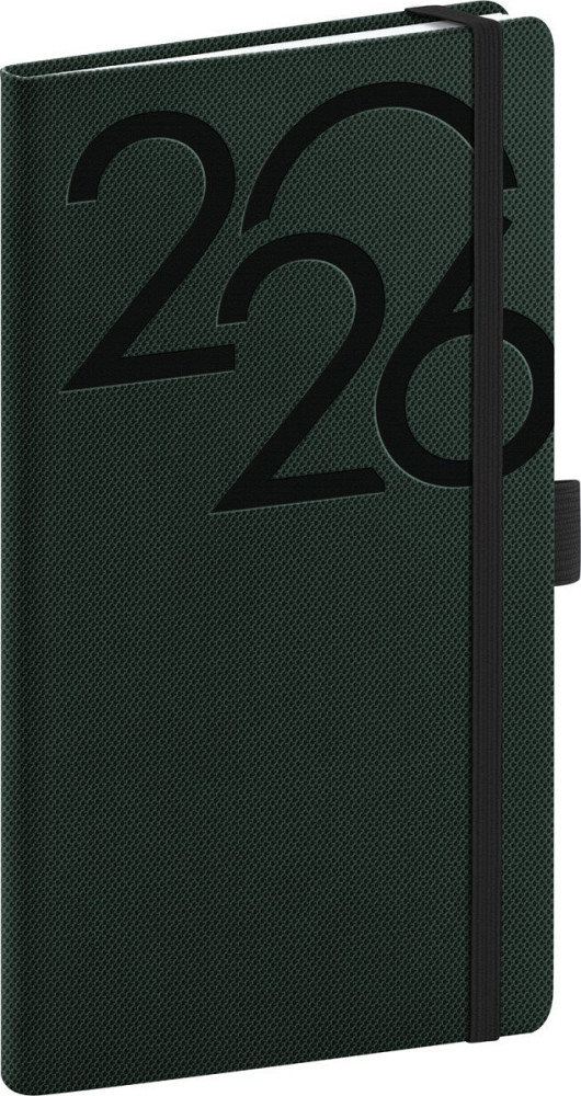 Kapesní diář Ajax 2026 v zelené barvě. Jemně strukturovaný povrch s atypickým reliéfem je vhodný pro všechny typy ražeb. Diář má zakulacené rohy, poutko na tužku a elastickou gumičku. Týdenní rozvrh s česko-slovenským kalendáriem a doplňkovou angličtinou, němčinou, maďarštinou a ruštinou.