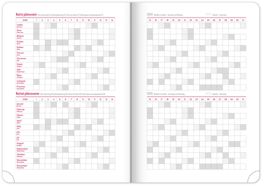 Týdenní diář Ajax 2026 ve zlaté barvě. Jemně strukturovaný povrch s atypickým reliéfem je vhodný pro všechny typy ražeb. Diář má zakulacené rohy, poutko na tužku a elastickou gumičku. Týdenní rozvrh s česko-slovenským kalendáriem a doplňkovou angličtinou, němčinou, maďarštinou a ruštinou.