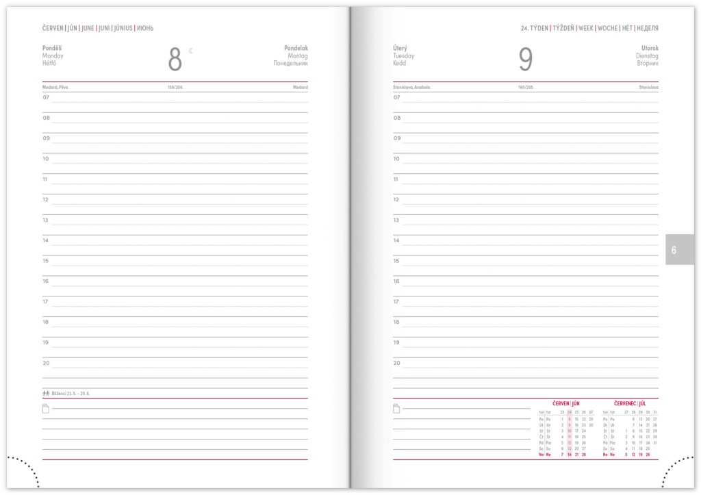 Denní diář Aprint 2026 v červené barvě. Kolekce vsadila na osvědčené barvy, které doplňuje nová ražba letopočtu. Denní rozvrh s česko-slovenským kalendáriem a doplňkovou angličtinou, němčinou, maďarštinou a ruštinou.